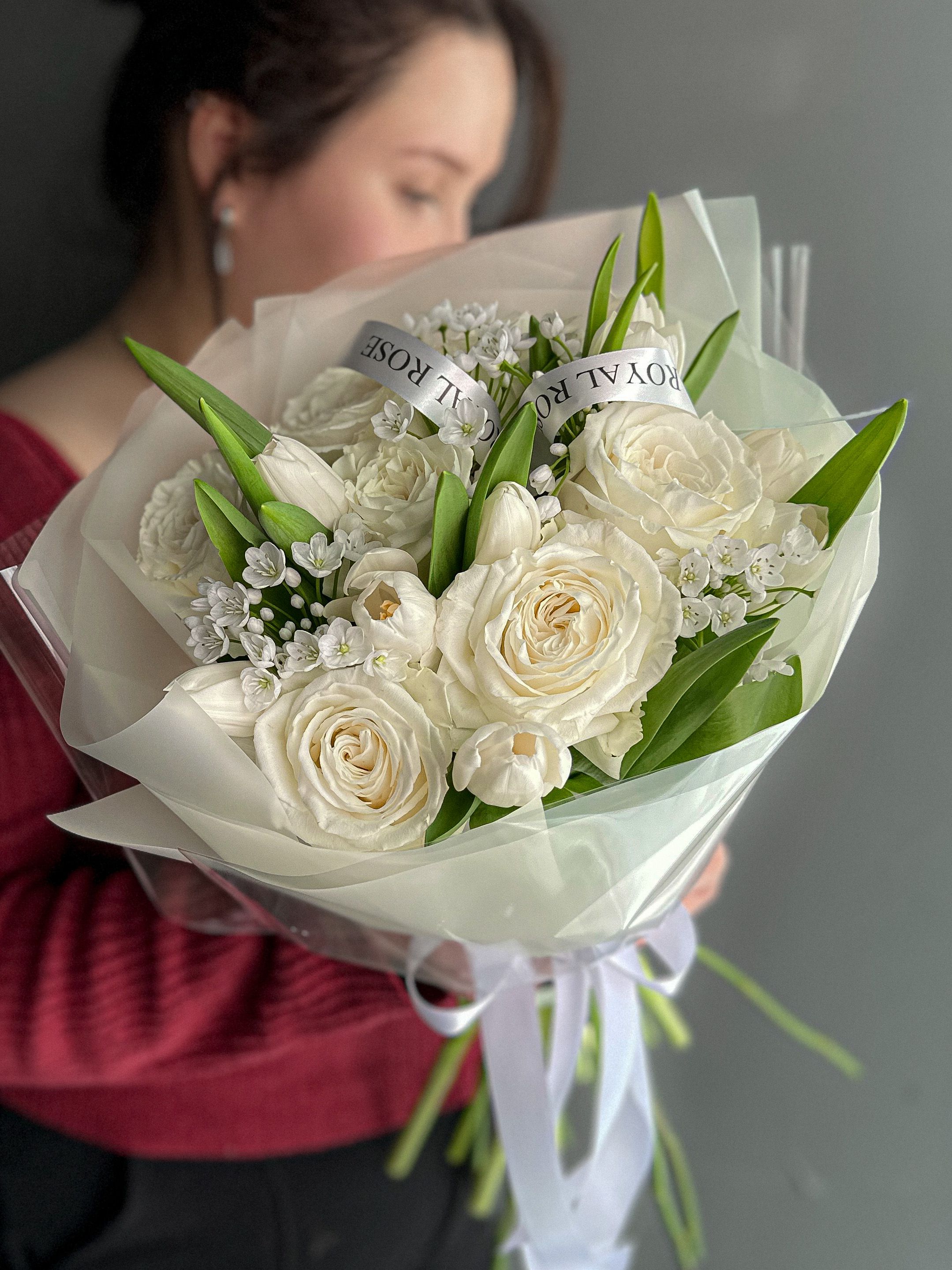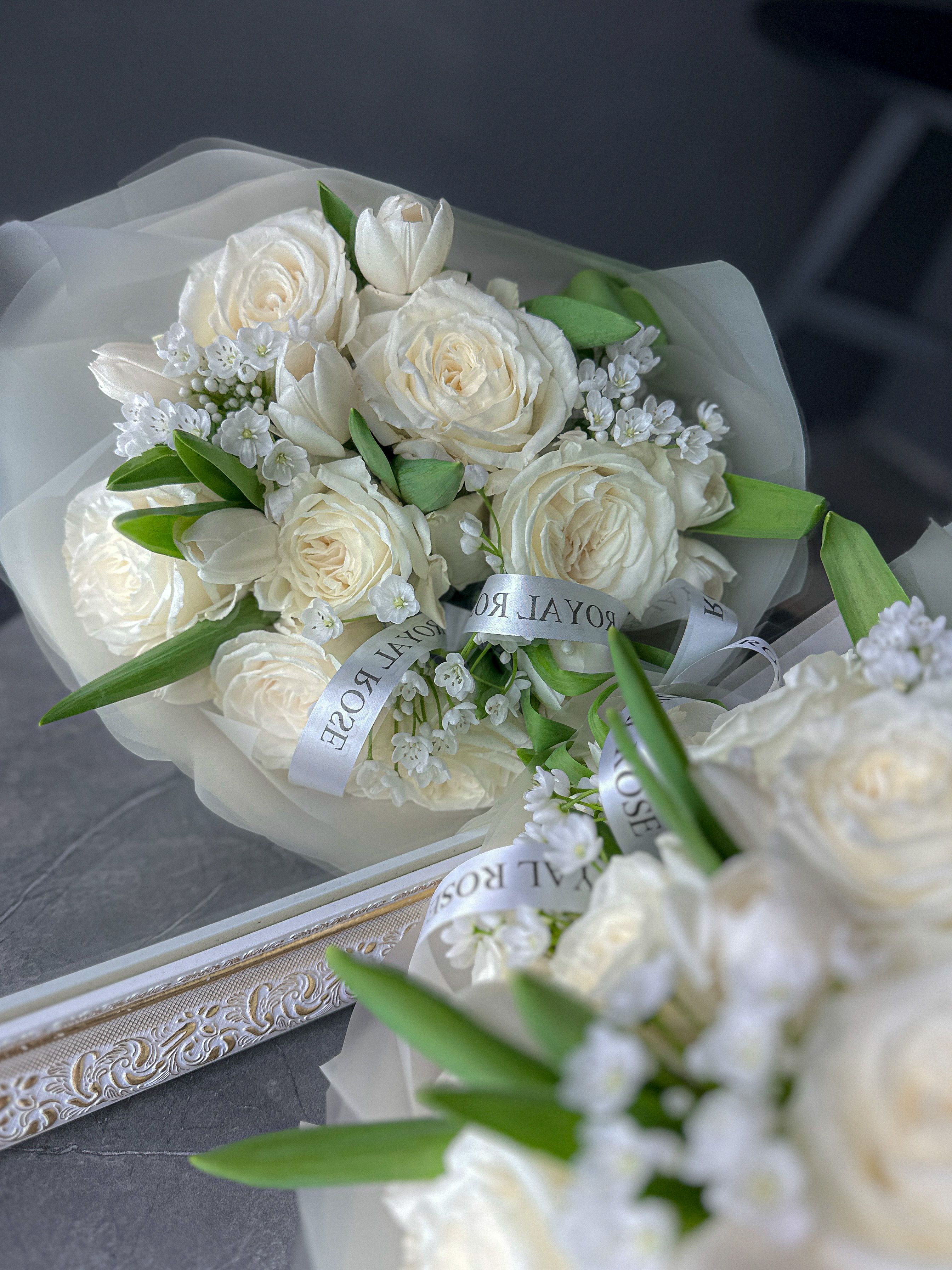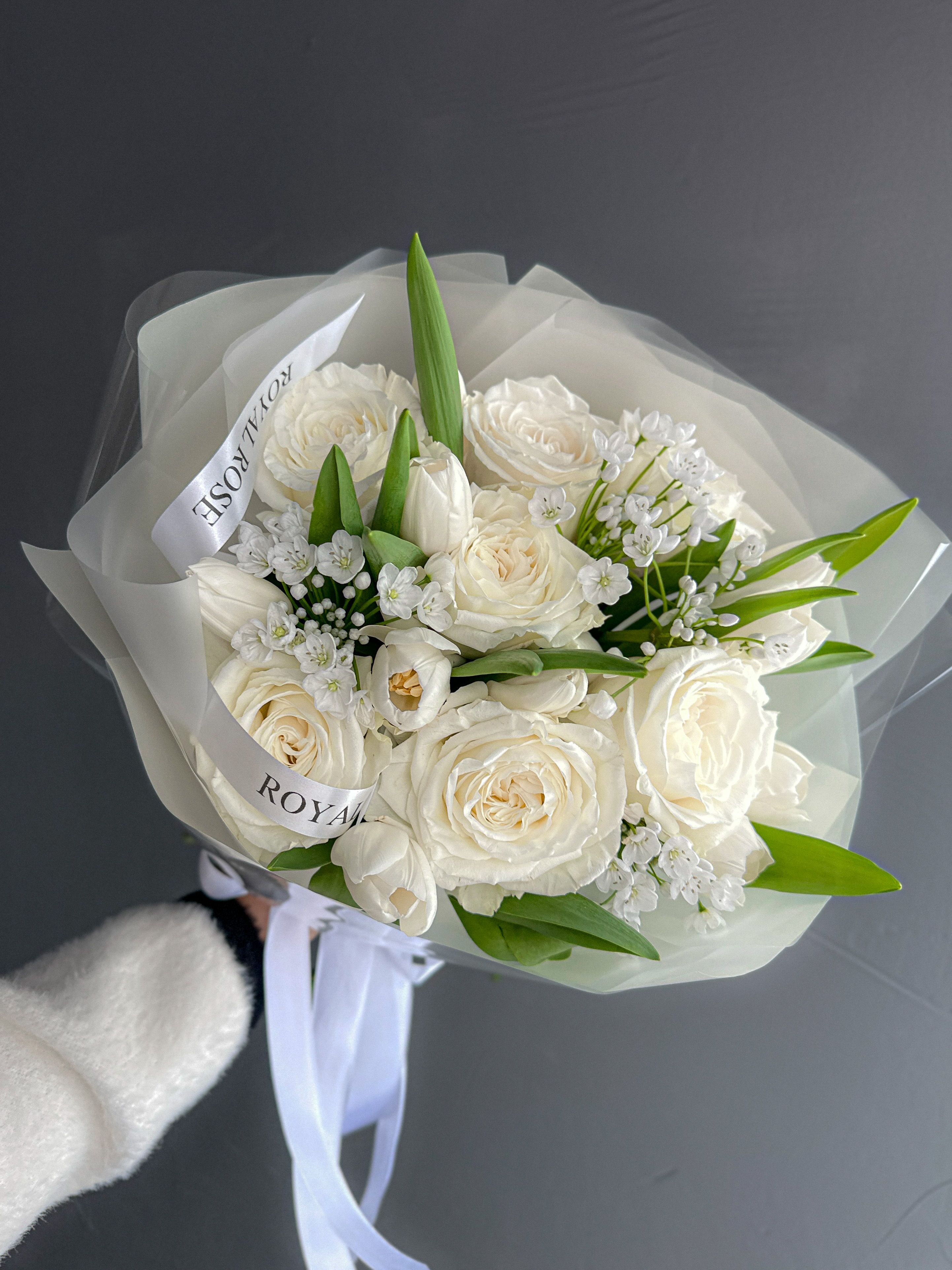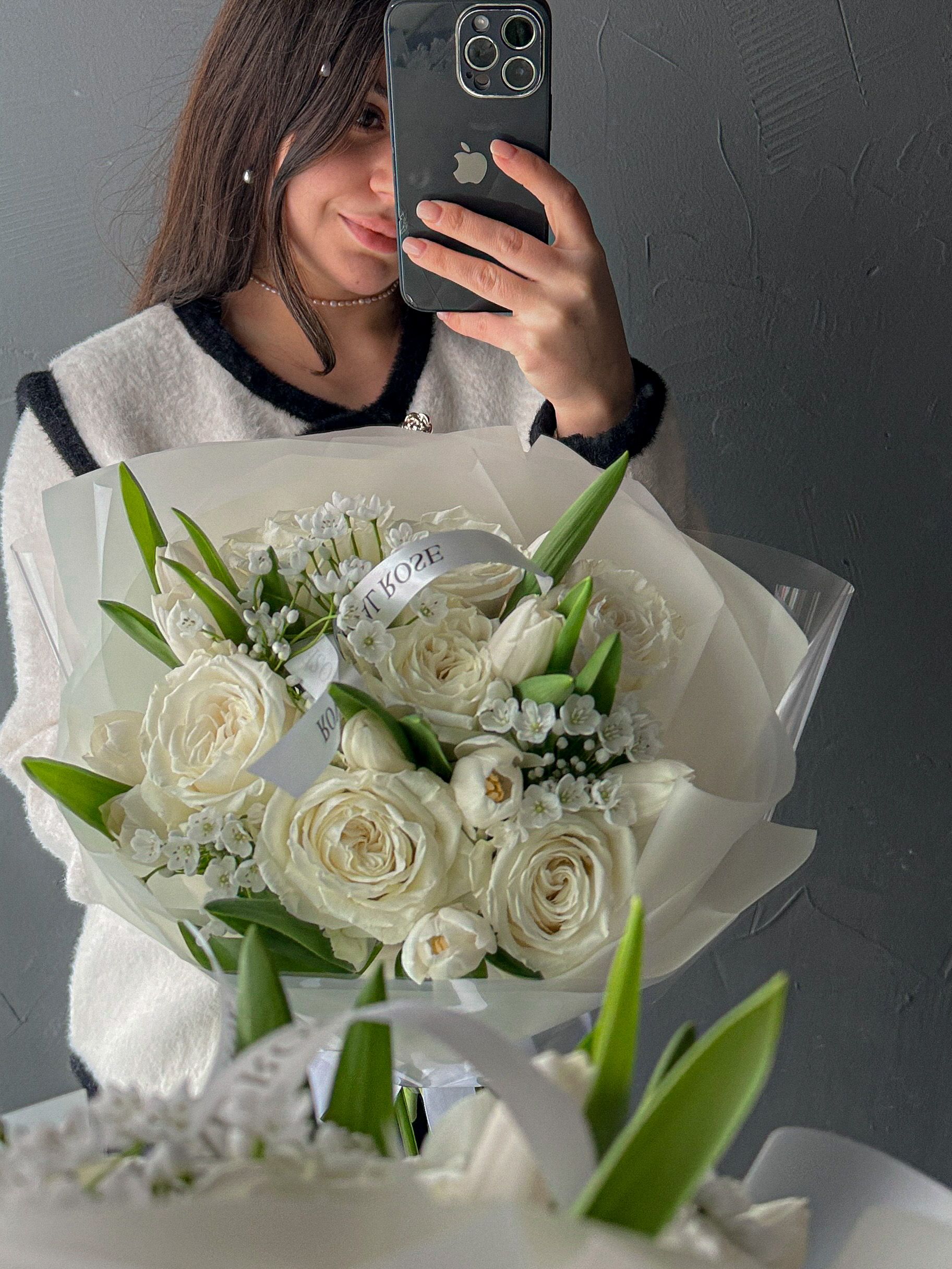 Настоящее волшебство в монохромной белой цветовой гамме. Белоснежные розы, весенние тюльпаны и сказочный Аллиум , словно нежнейшие подснежники среди снежной поляны