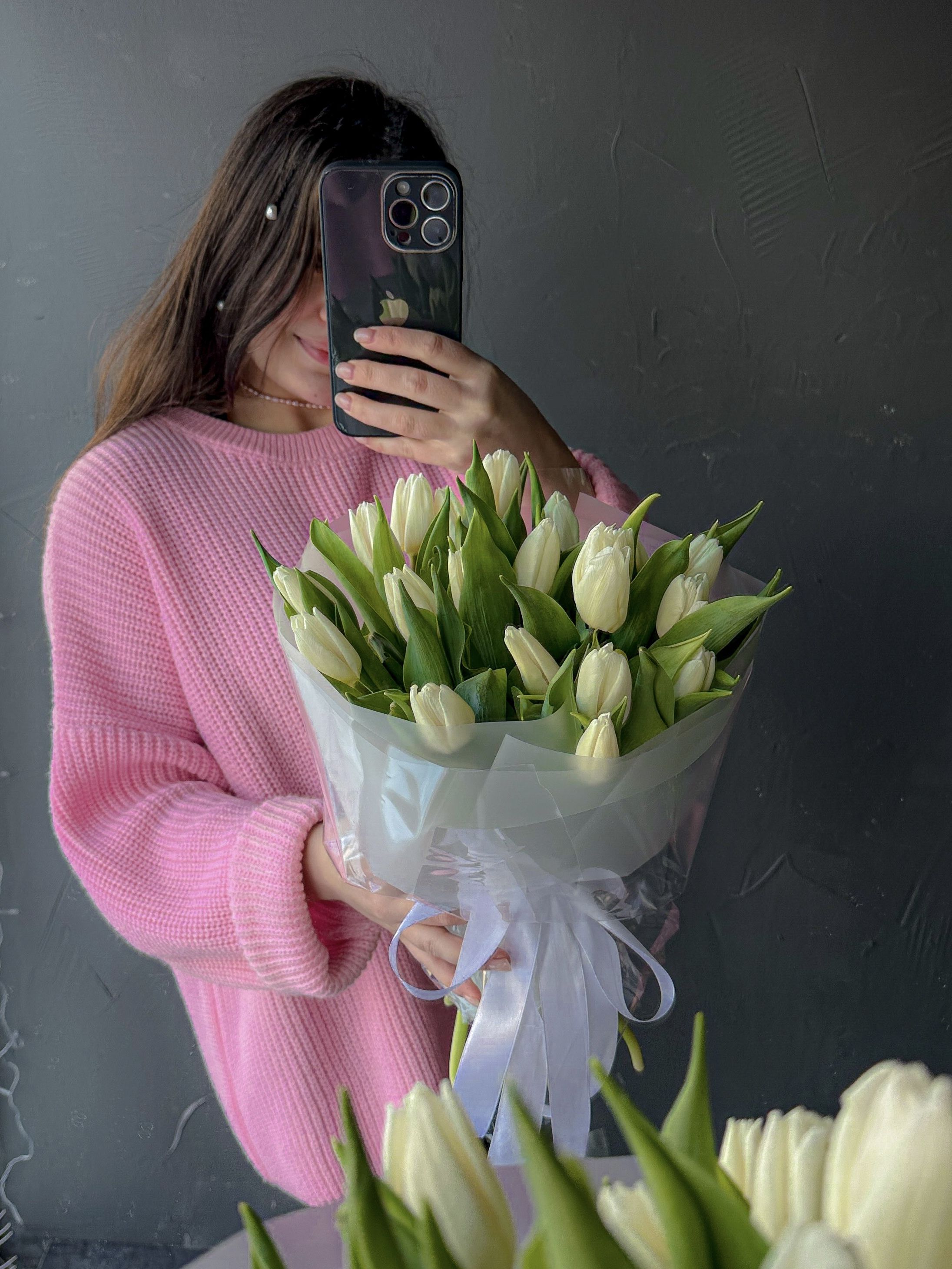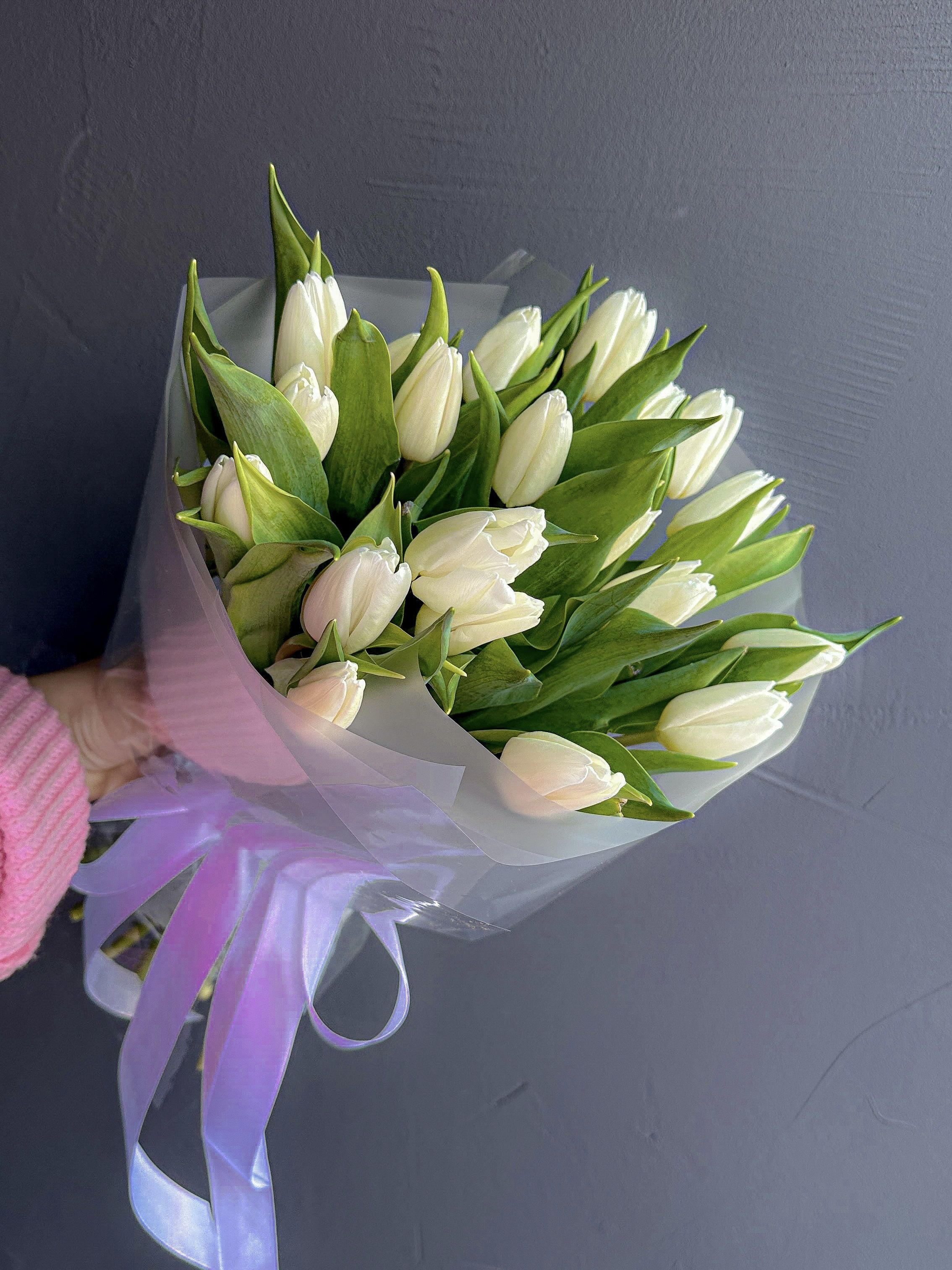 Букет «Minimalism» из молочно-белых тюльпанов в полупрозрачной стильной упаковке