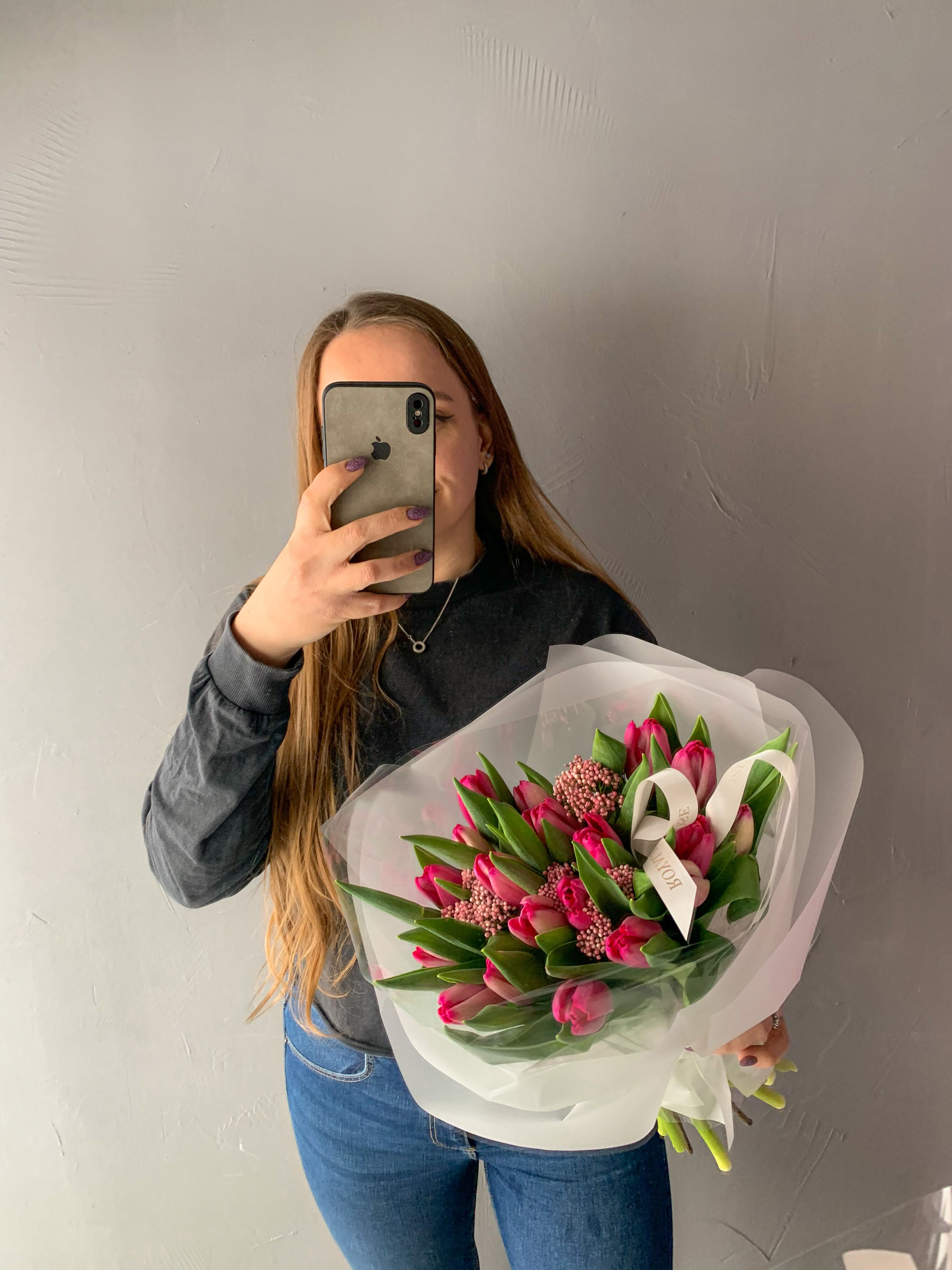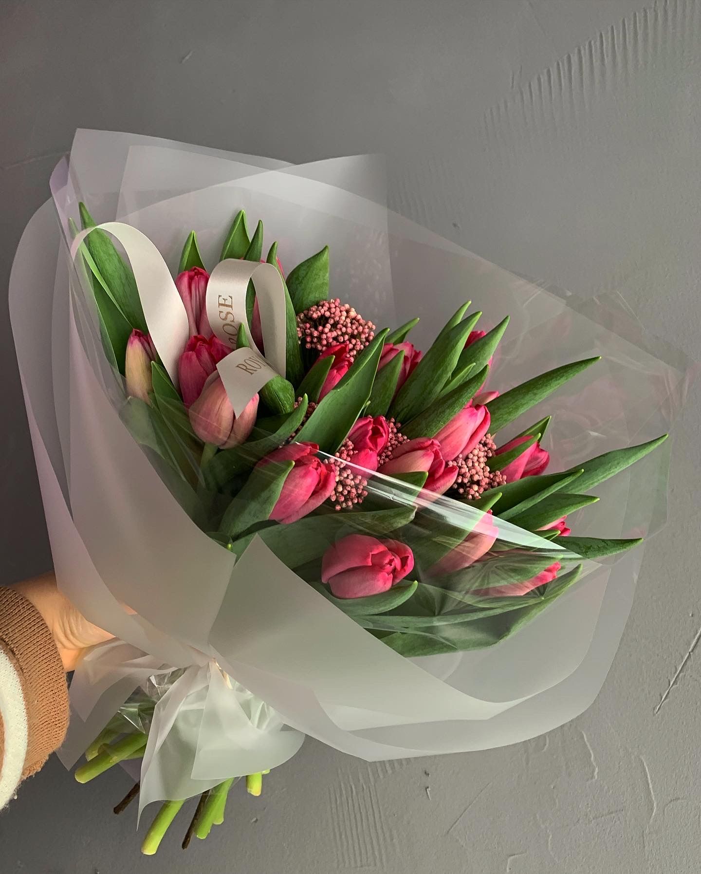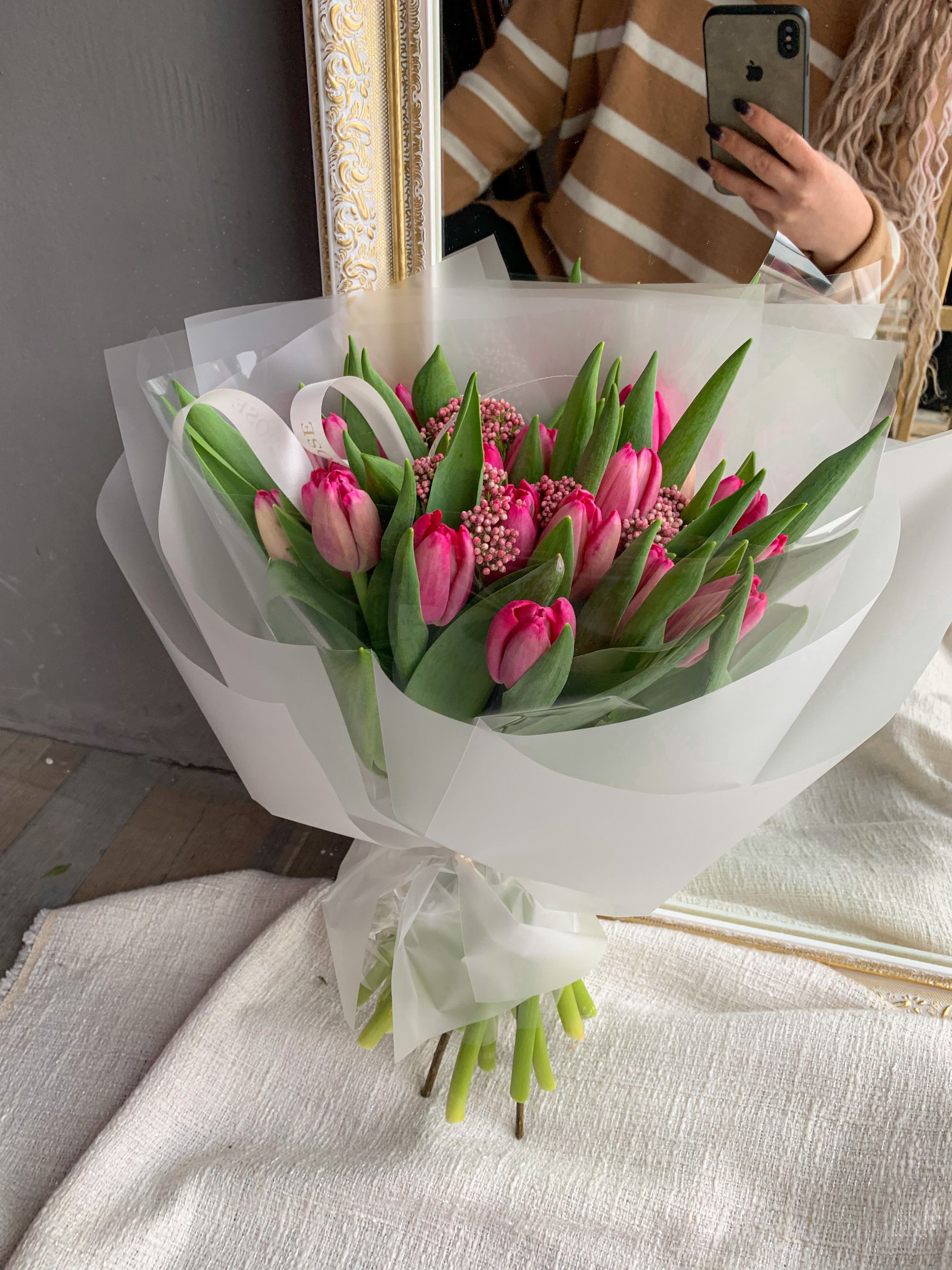 Эффектный букет из тюльпанов в розовом оттенке в стильной матовой упаковке. Букет украшен ягодками озотамнуса