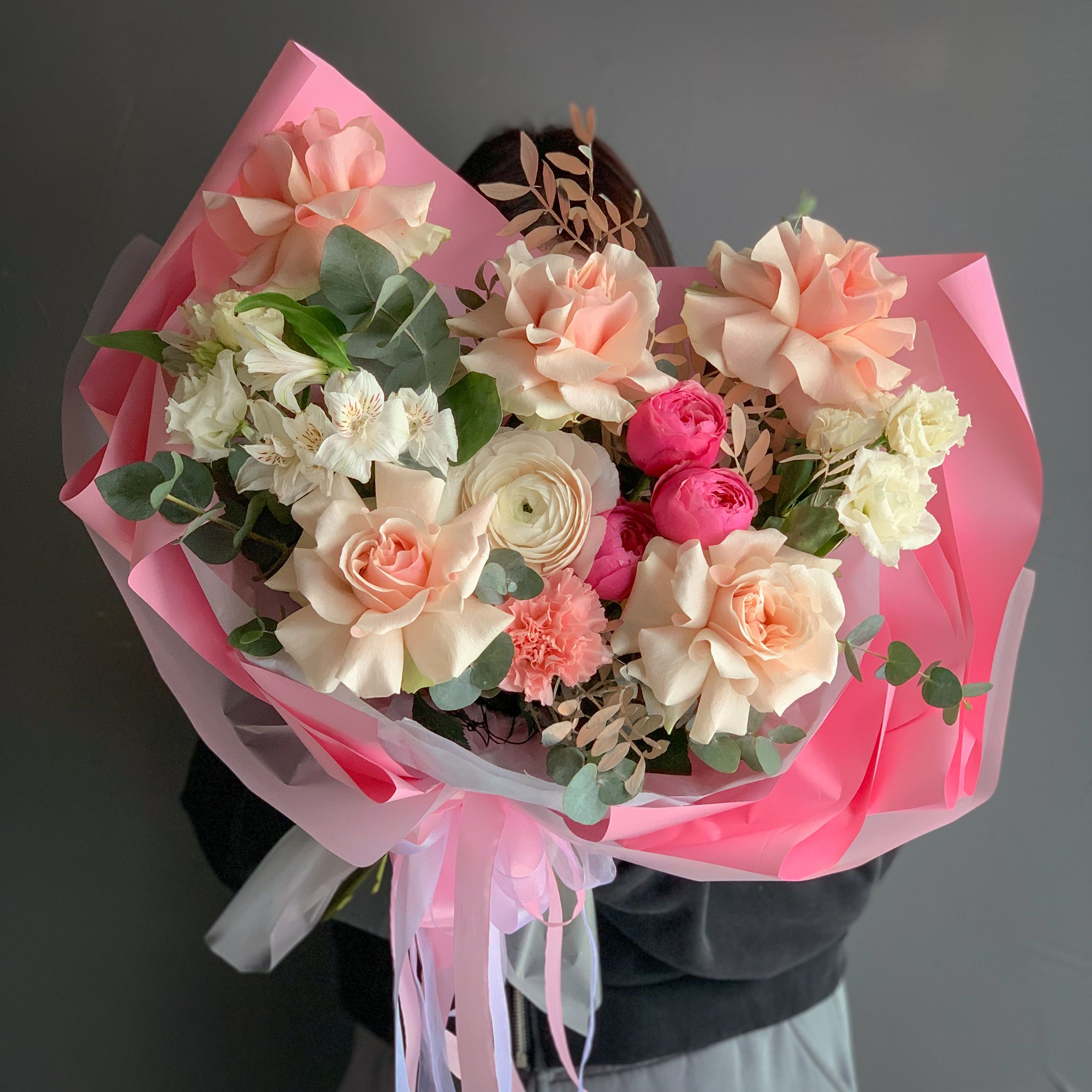 Стильный букет с ажурными розами, кустовой пионовидной розой, декоративной зеленью и эвкалиптом.