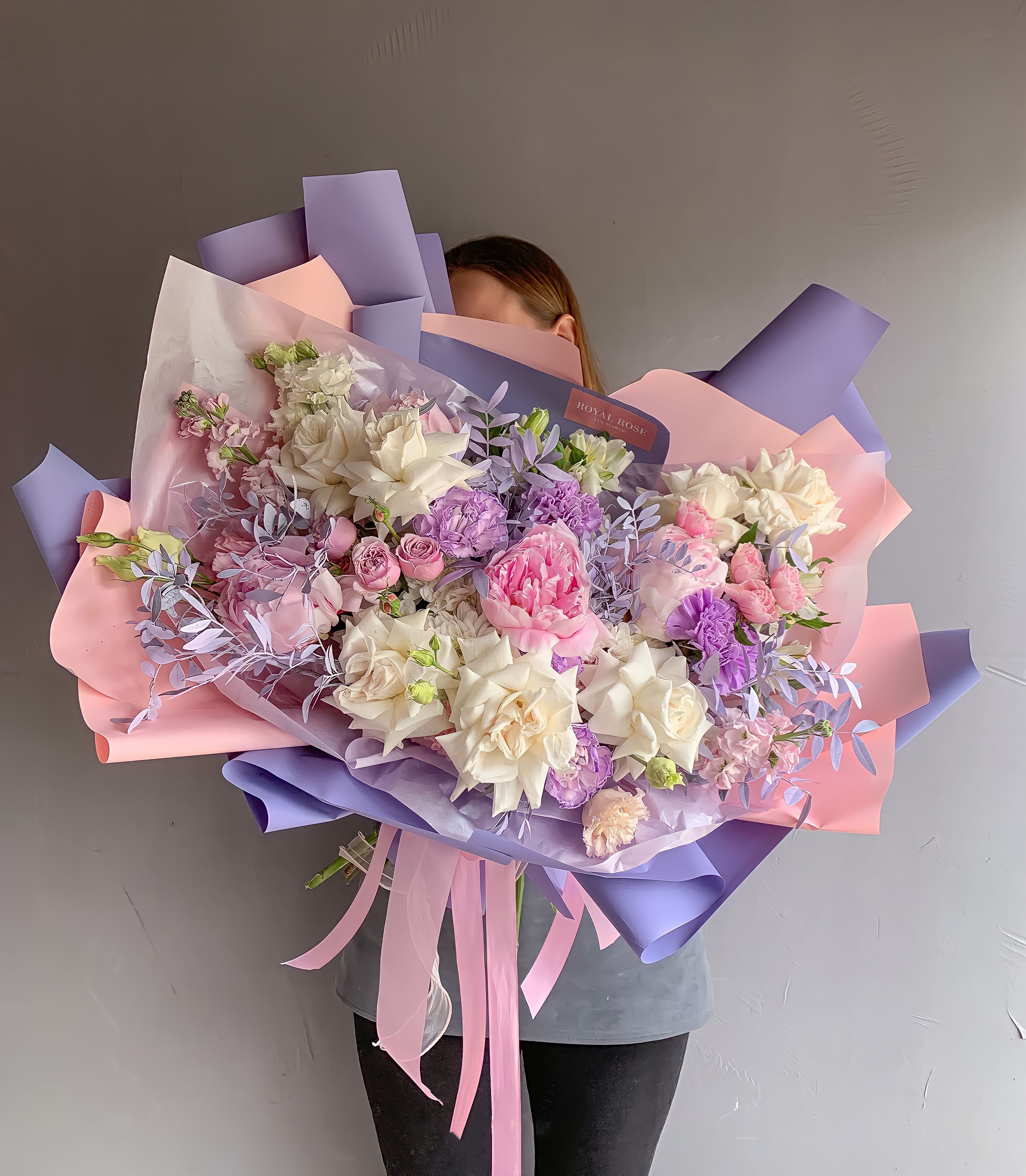 Стильный большой букет в стильной матовой упаковке из роз, махровой эустомы, альстромерий, гвоздик м зелени.