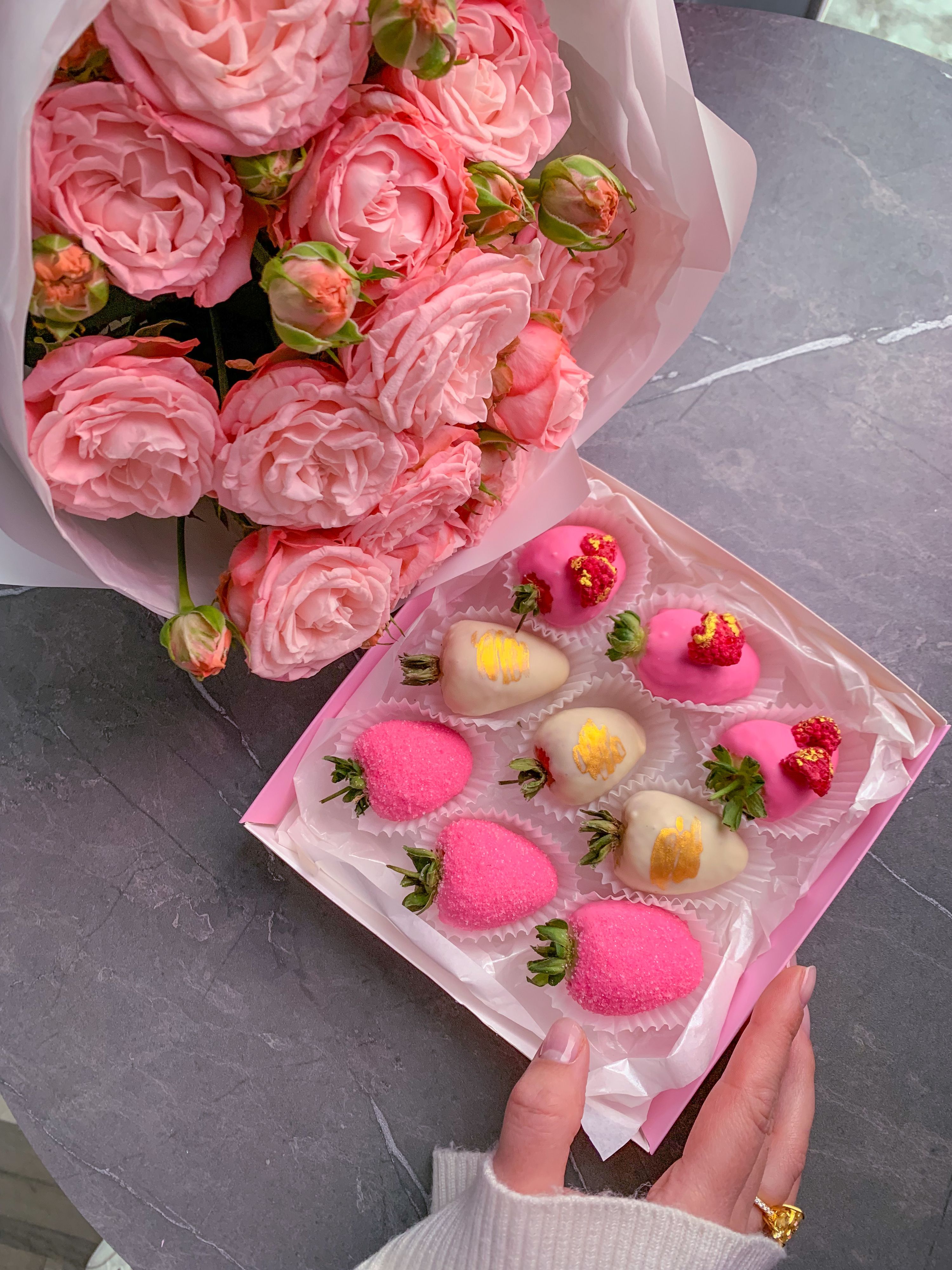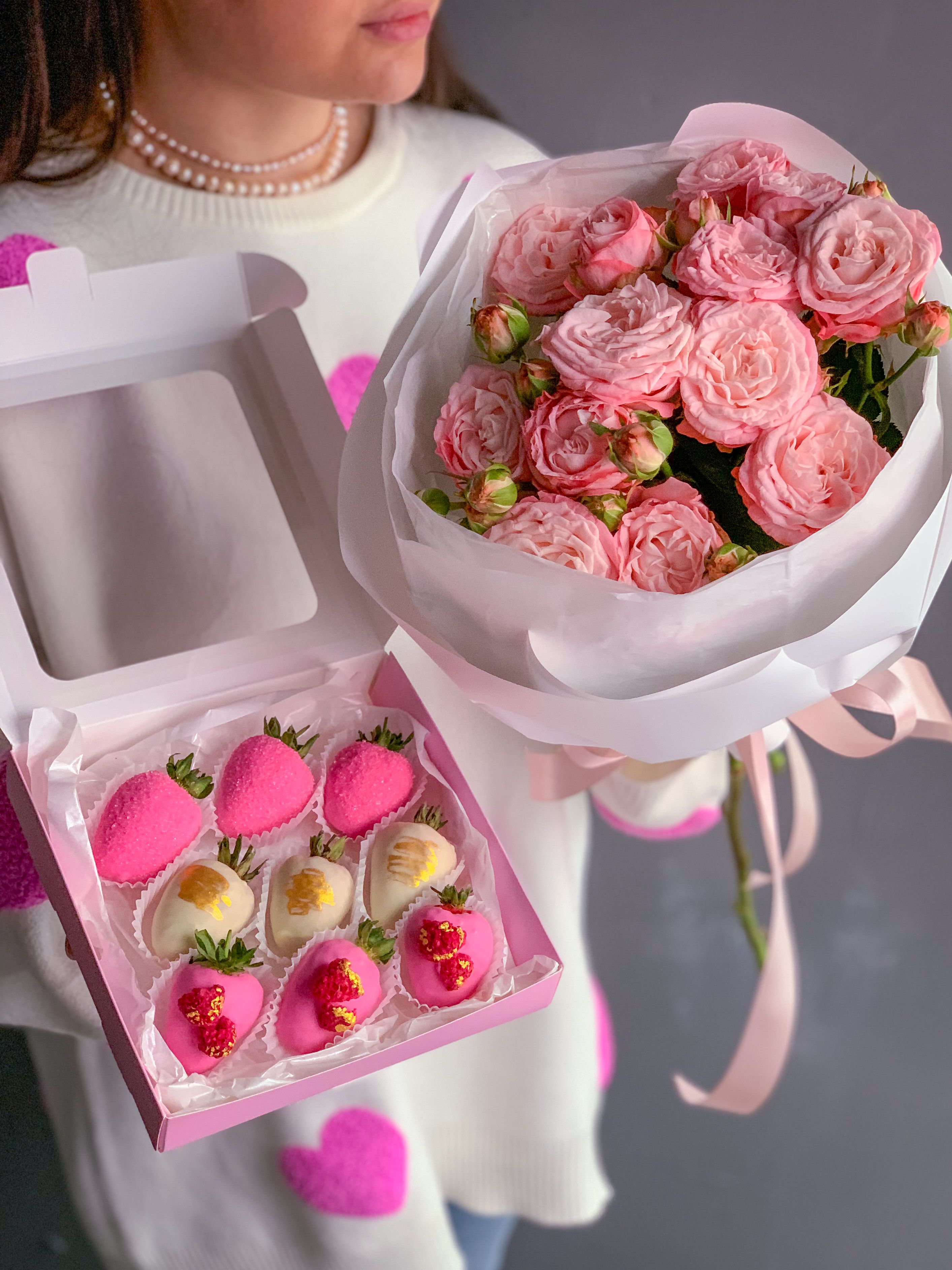 Вкусный и приятный комплимент. Десерт и пионовидные розы в одном наборе!) Всё что нужно для прекрасного настроения!