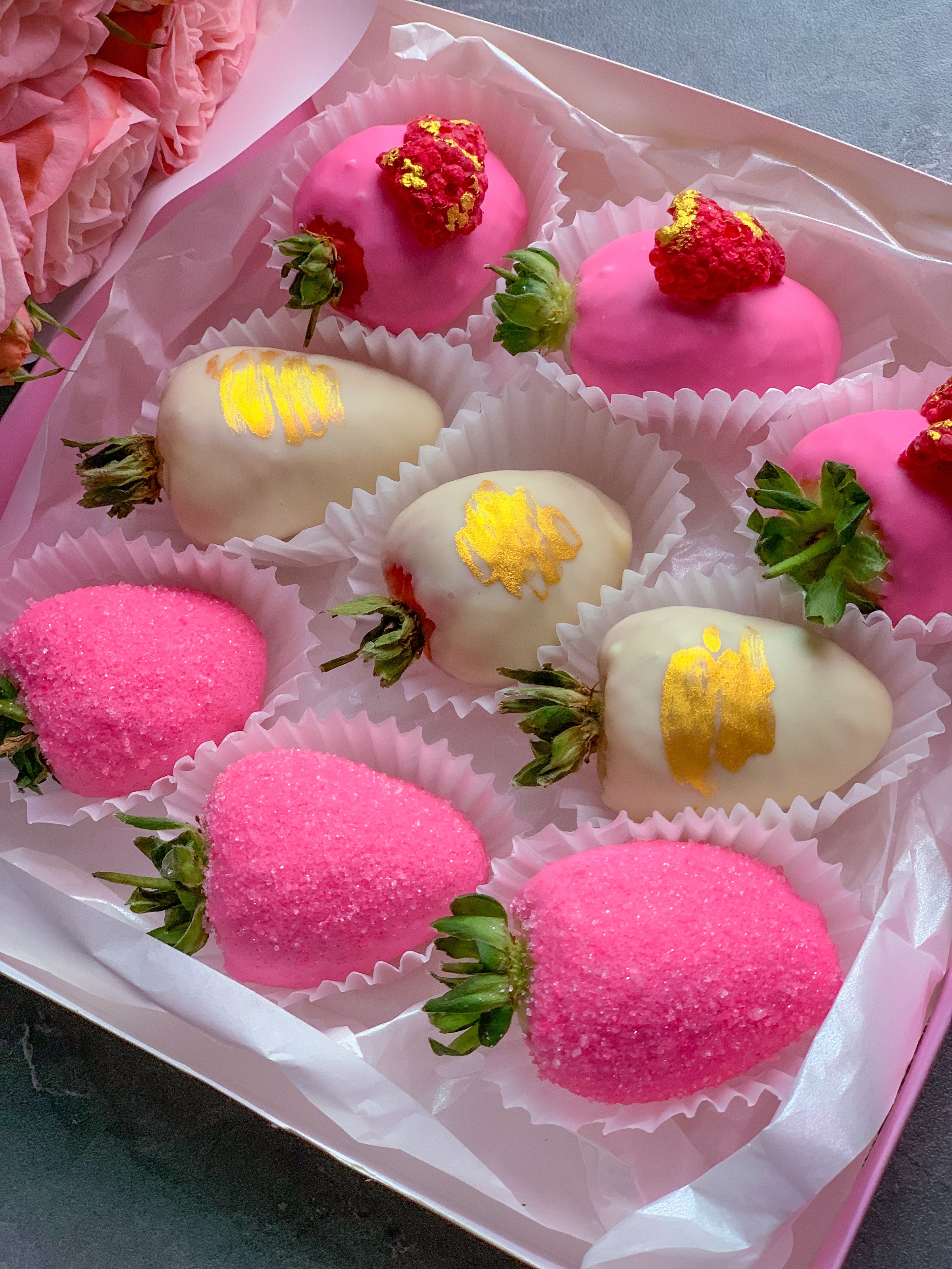Невероятно красивый комбо набор из кустовых пионовых роз и клубники в розовом и белом бельгийском шоколаде. Свежие ягоды клубники украшены сахарными кристаллами, золотом и кусочками малины.