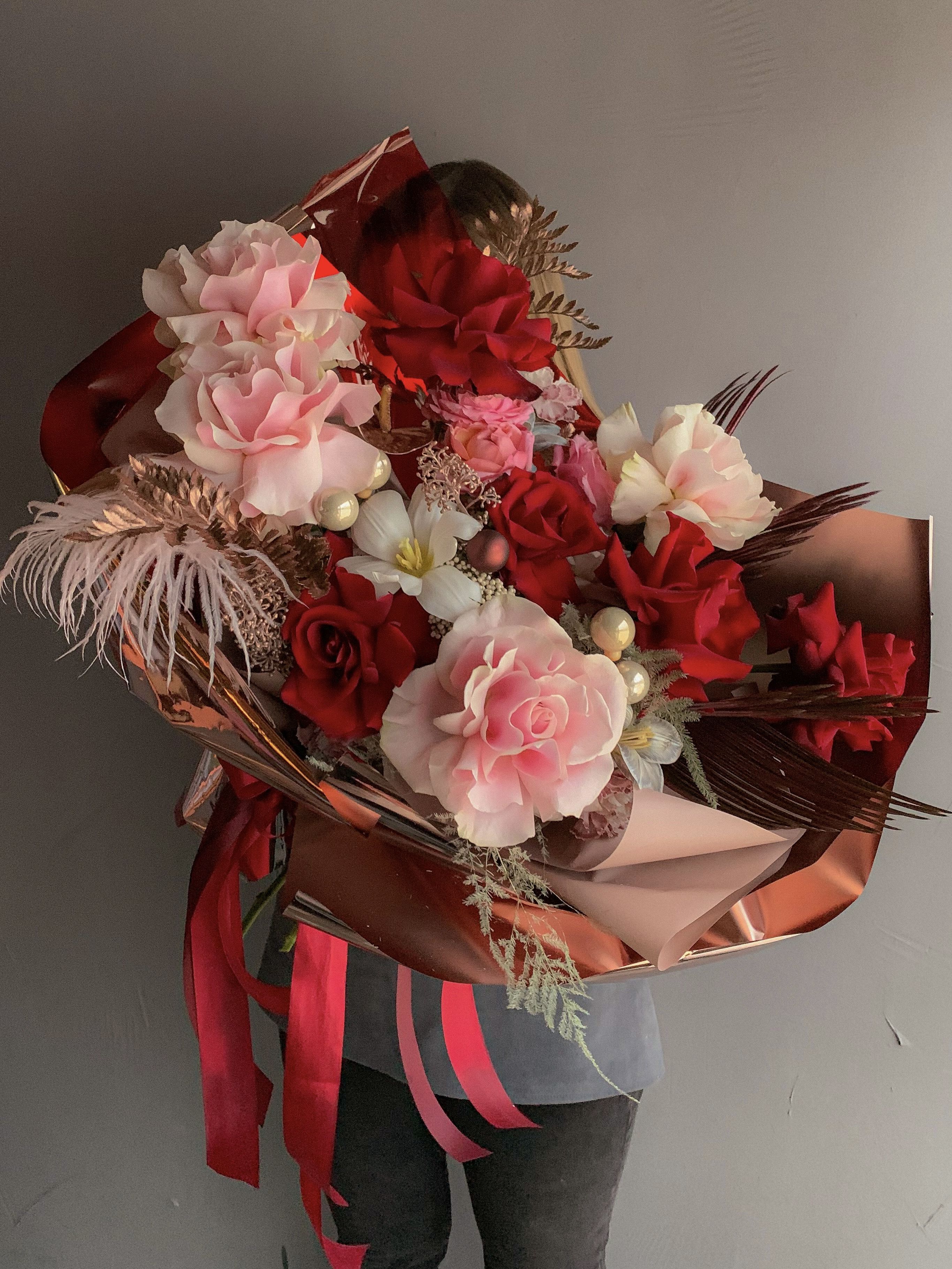 Роскошный букет с розовыми и красными розами, декоративными перьями, тюльпанами и золотисто-медной зеленью