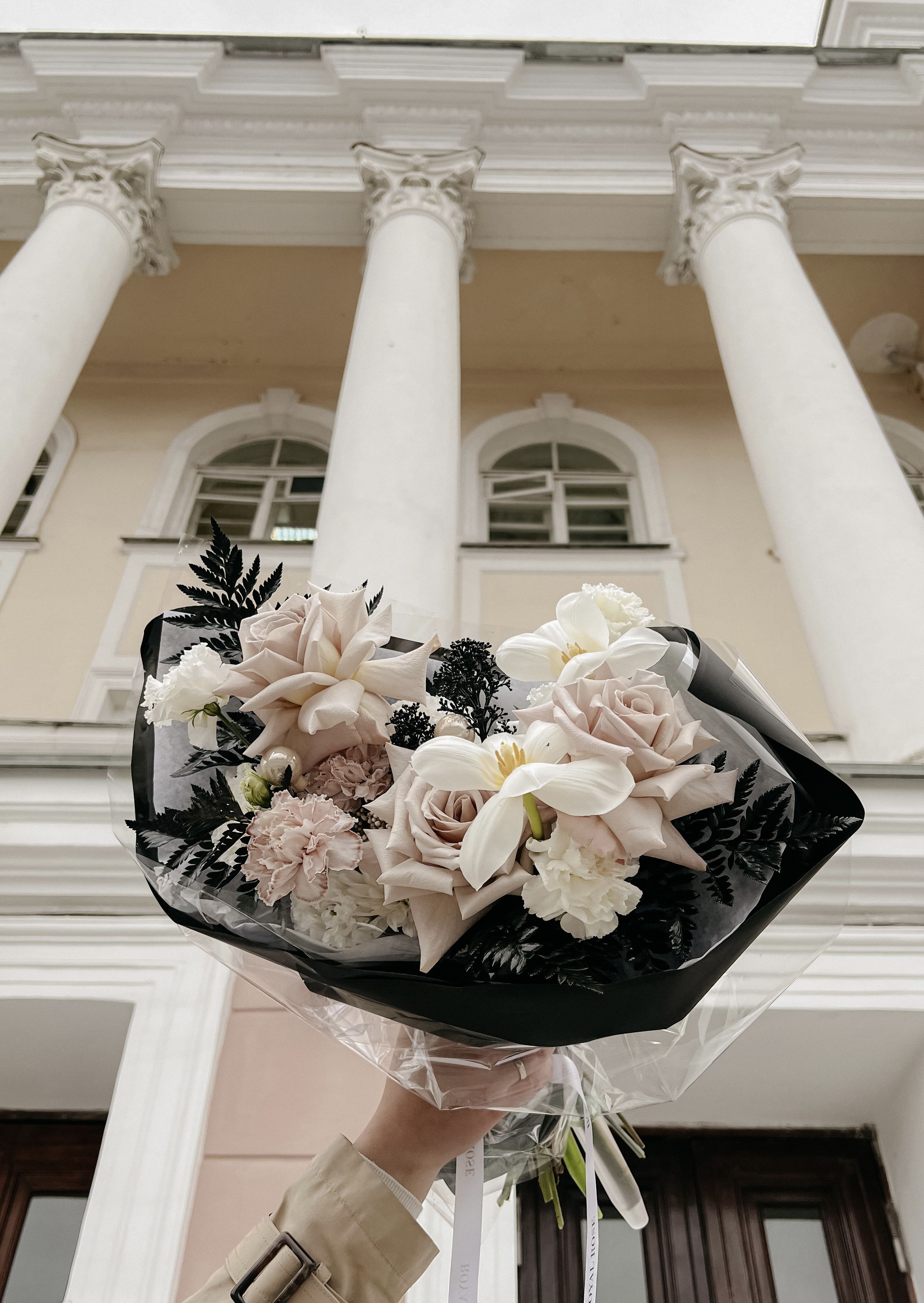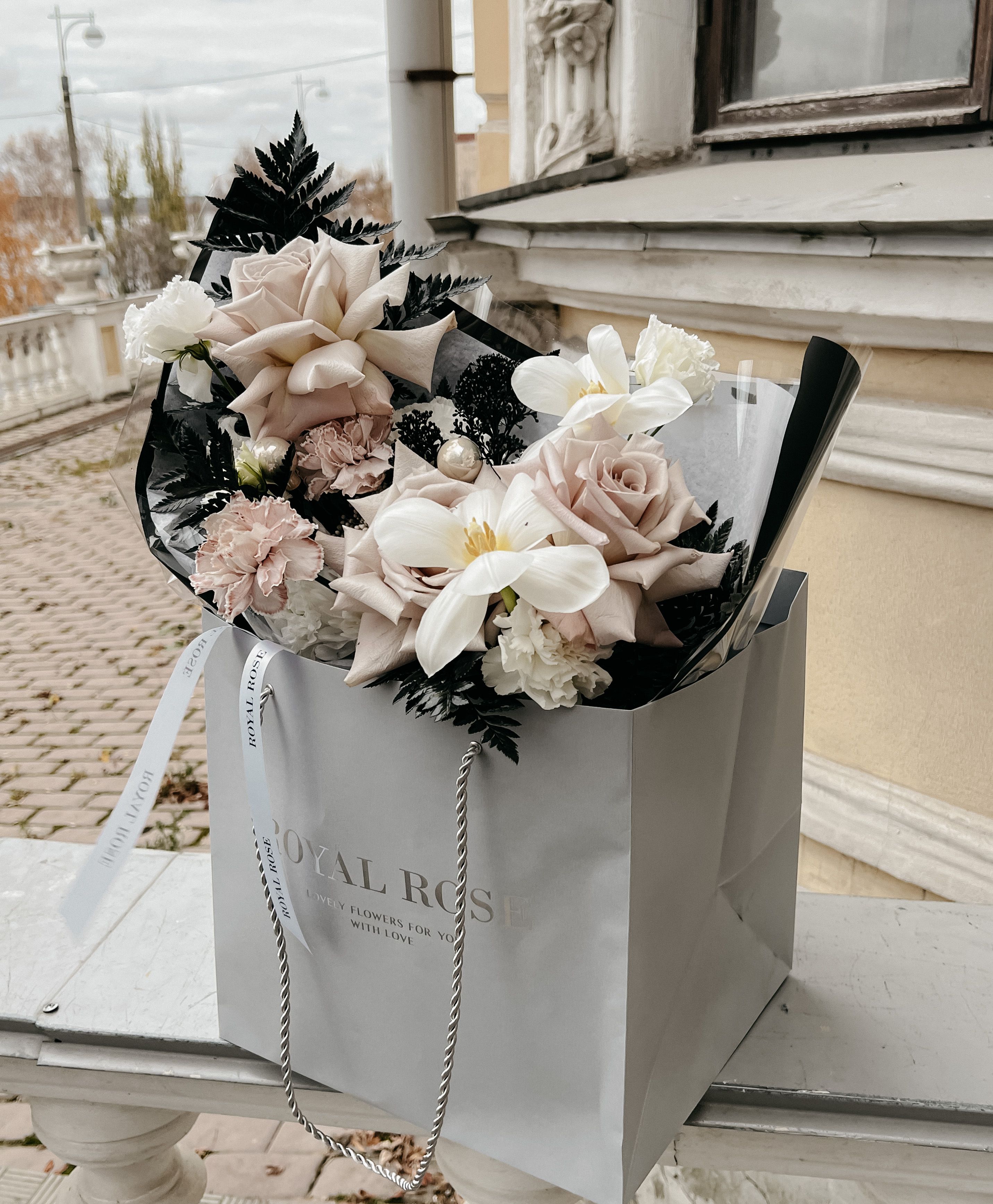 Роскошный букет в размере S+ из кружевных роз, коричневых диантусов, тюльпанов, шариков, эустомы и папоротника в стильном фирменном пакете переноске