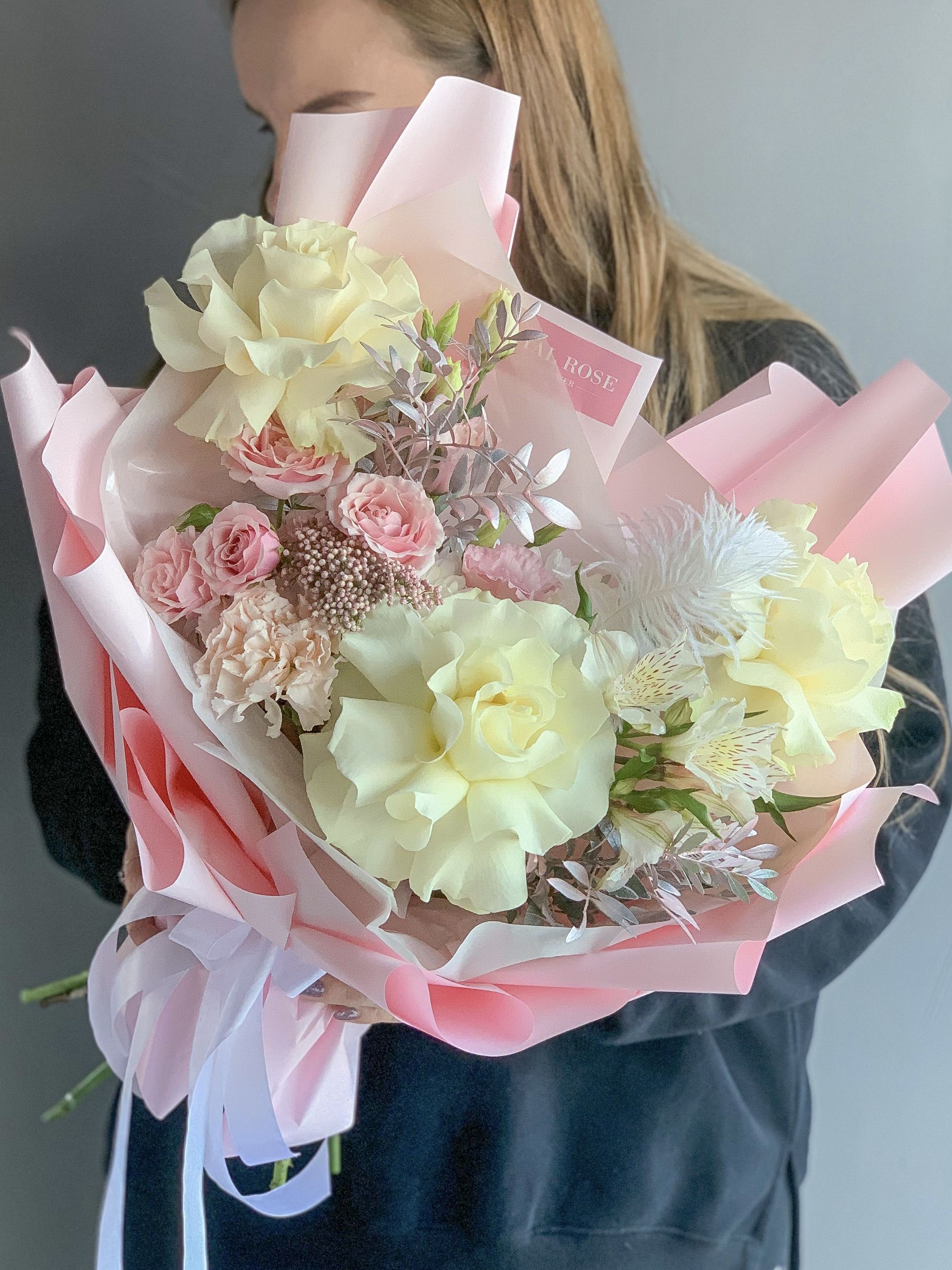 Нежный букет с белыми кружевными розами, альстромерией, ароматным эвкалиптом, белой хризантемой и эустомой в нашей фирменной упаковке