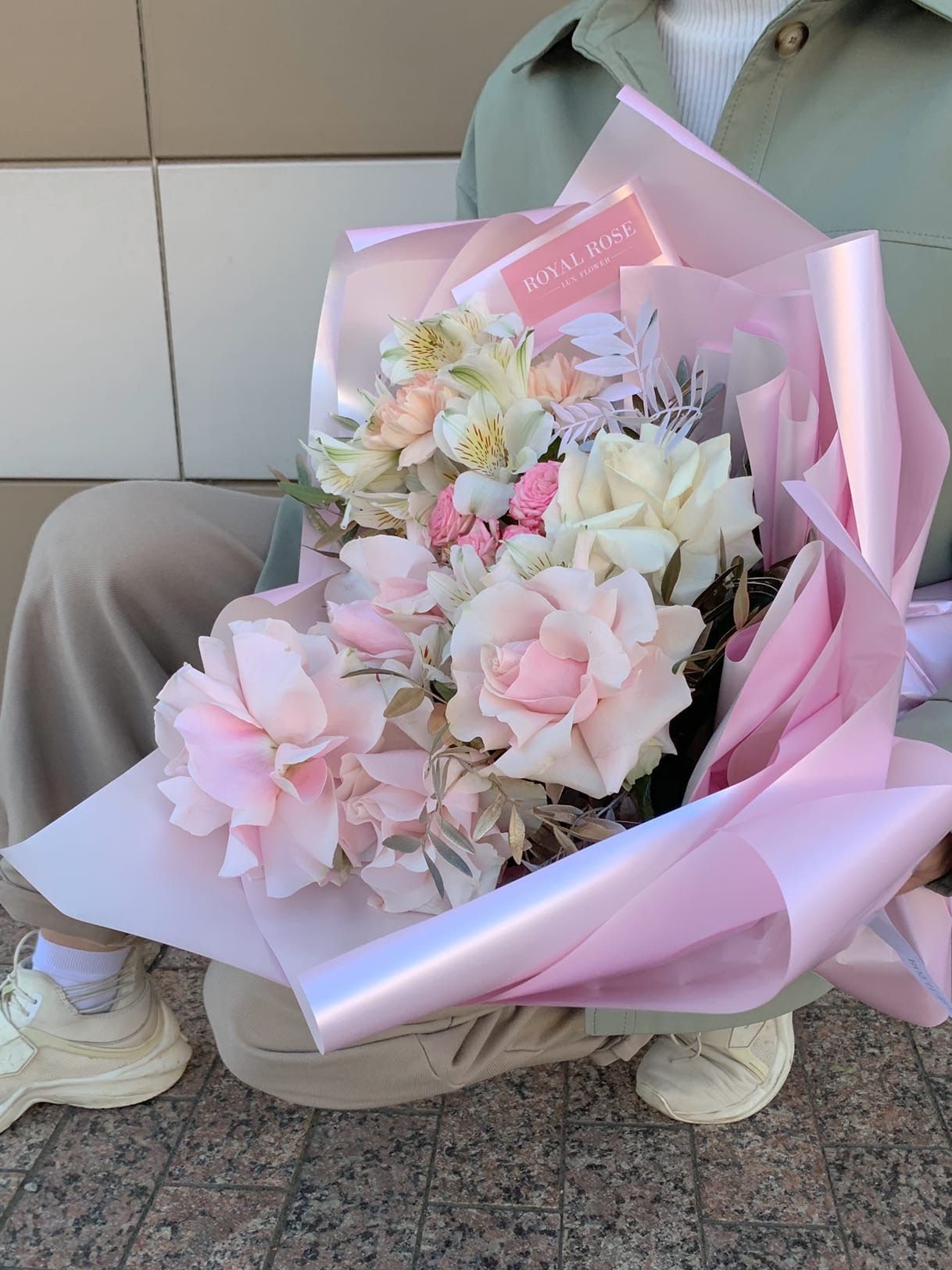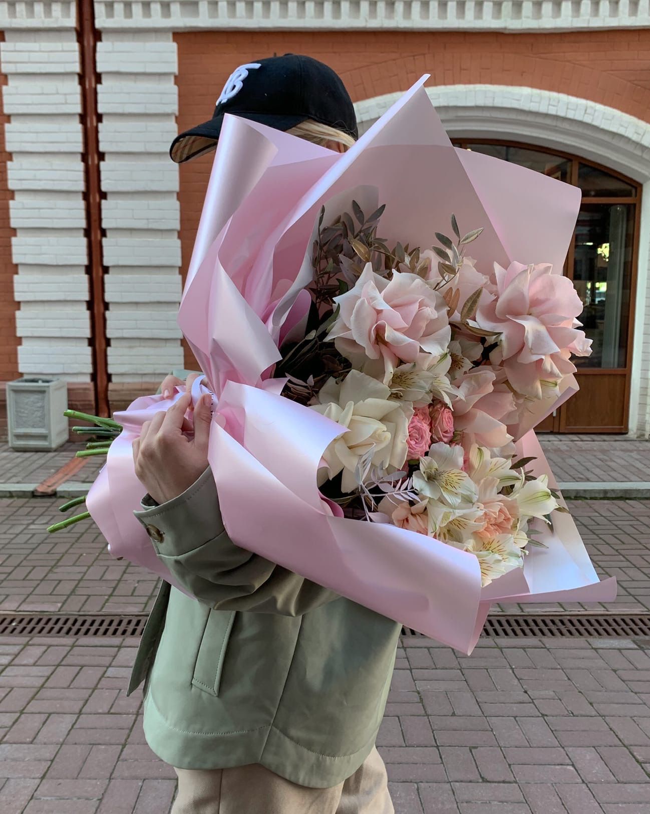 Нежный и воздушный букет из кружевных роз, бело-золотой зелени, альстромерий и кустовых роз
