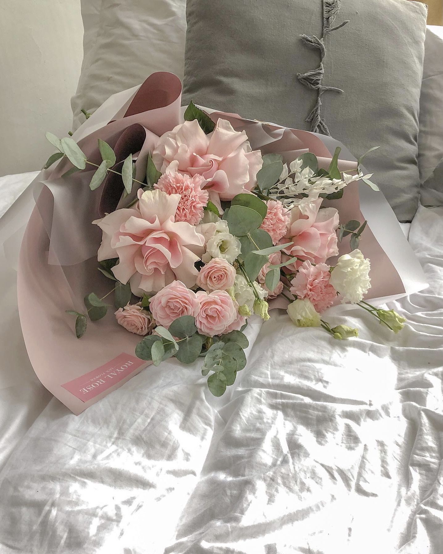 В составе нежнейшие розовые кружевные розы, ароматный эвкалипт, эустома, гвоздики, кустовая розочка и белый рускус