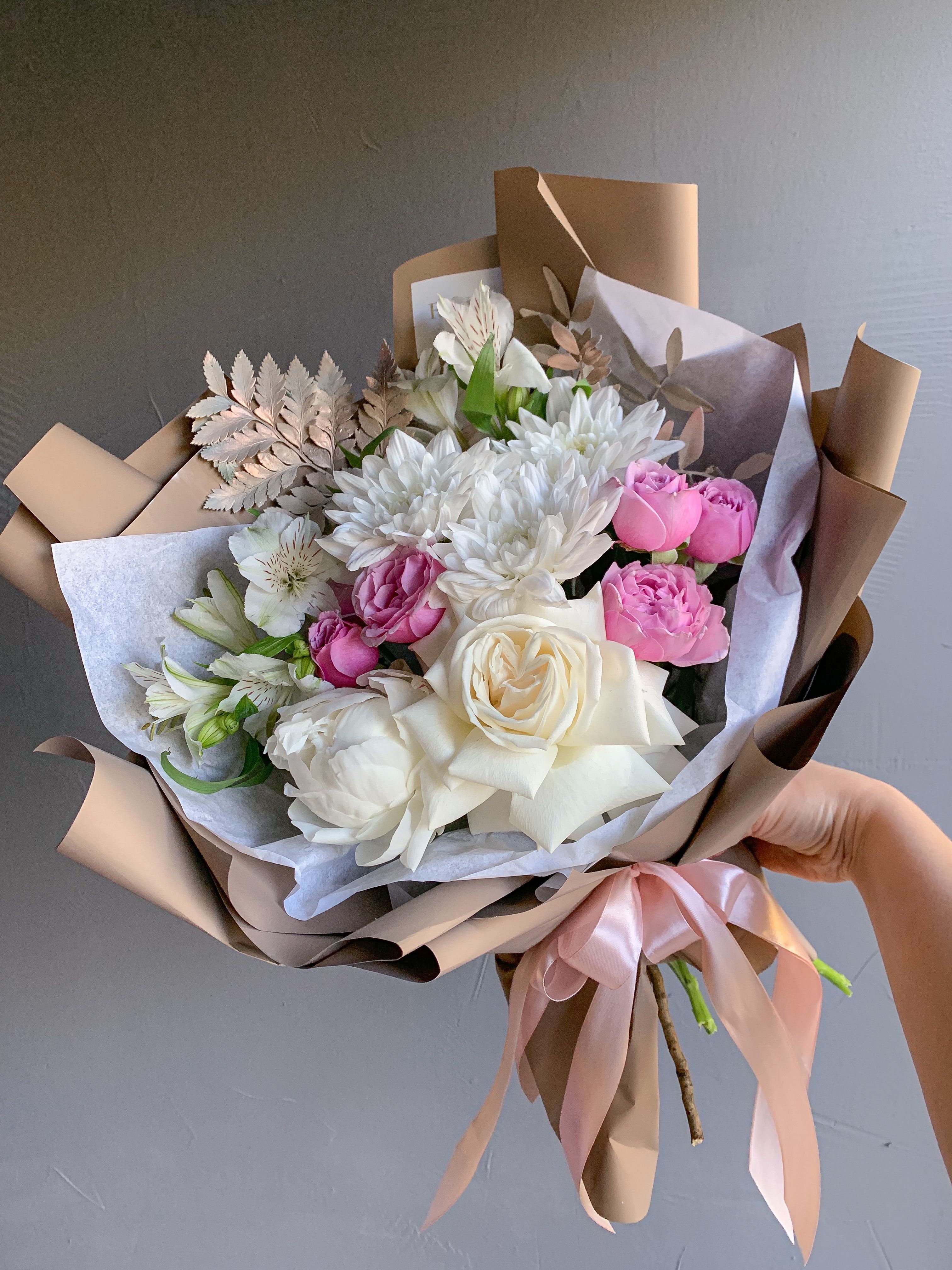 Букет с пионовидными розами и папоротником
