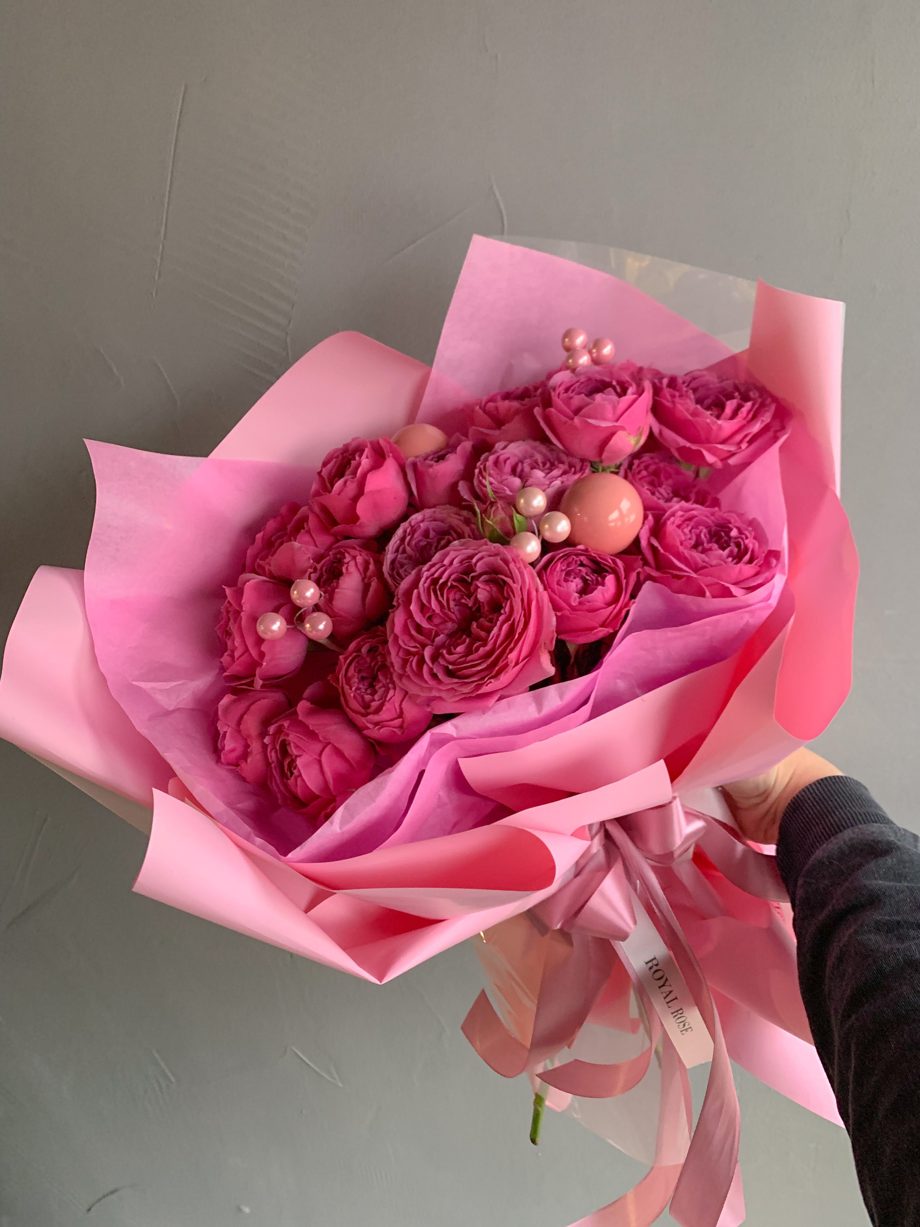 Букет пионовидных роз с бусинками - изысканное и роскошное сочетание классики и оригинальности. Этот уникальный букет подарит ощущение нежности и элегантности в любой день, станет стильным акцентом в интерьере или замечательным подарком для особого человека.