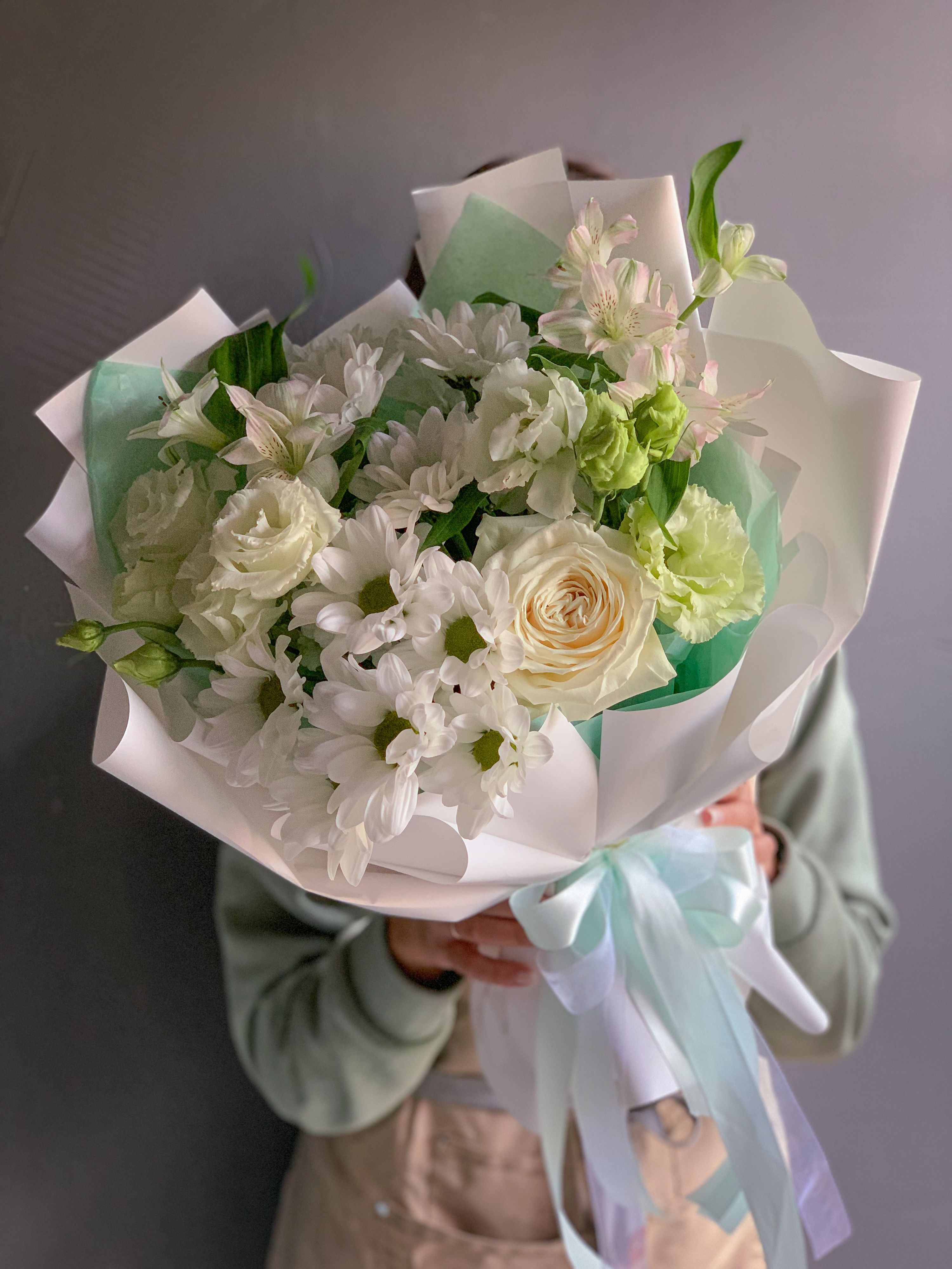 little charm Нежный букет из хризантемы, гвоздики, кустовой розы и белой зелени в фирменной упаковке 3 490 ₽ Оформить заказ Нежный букет из хризантемы, гвоздики, кустовой розы и белой зелени в фирменной упаковке Дополнения к букетурекомендуемФирменная VIP открытка к букету 100 ₽Набор мыла ручной работы: Love 1 100 ₽Мыло-комплимент Peony 450 ₽Набор мыла «Lovely hearts» 1 430 ₽Коробочка с клубникой тиффани 3 500 ₽