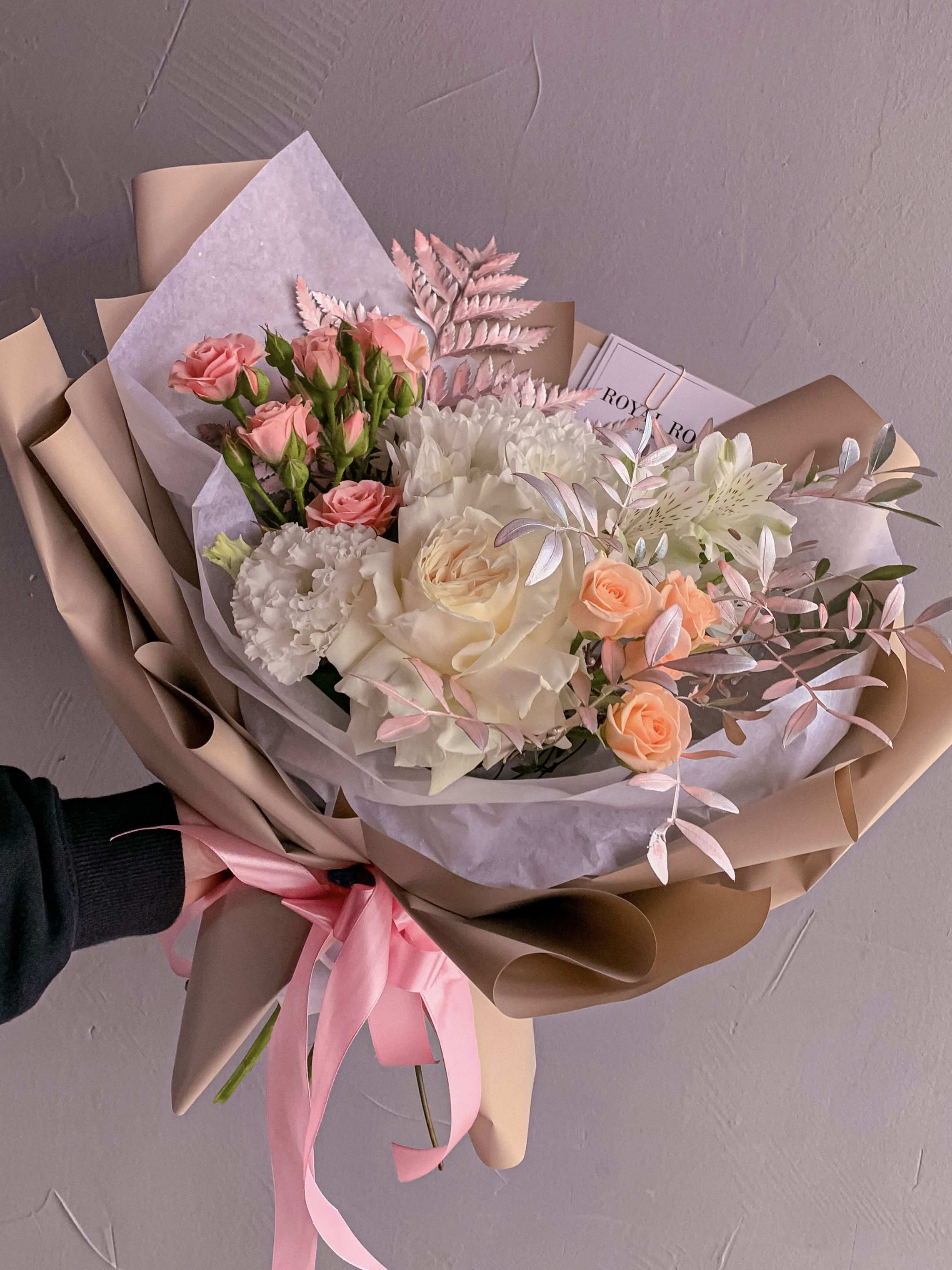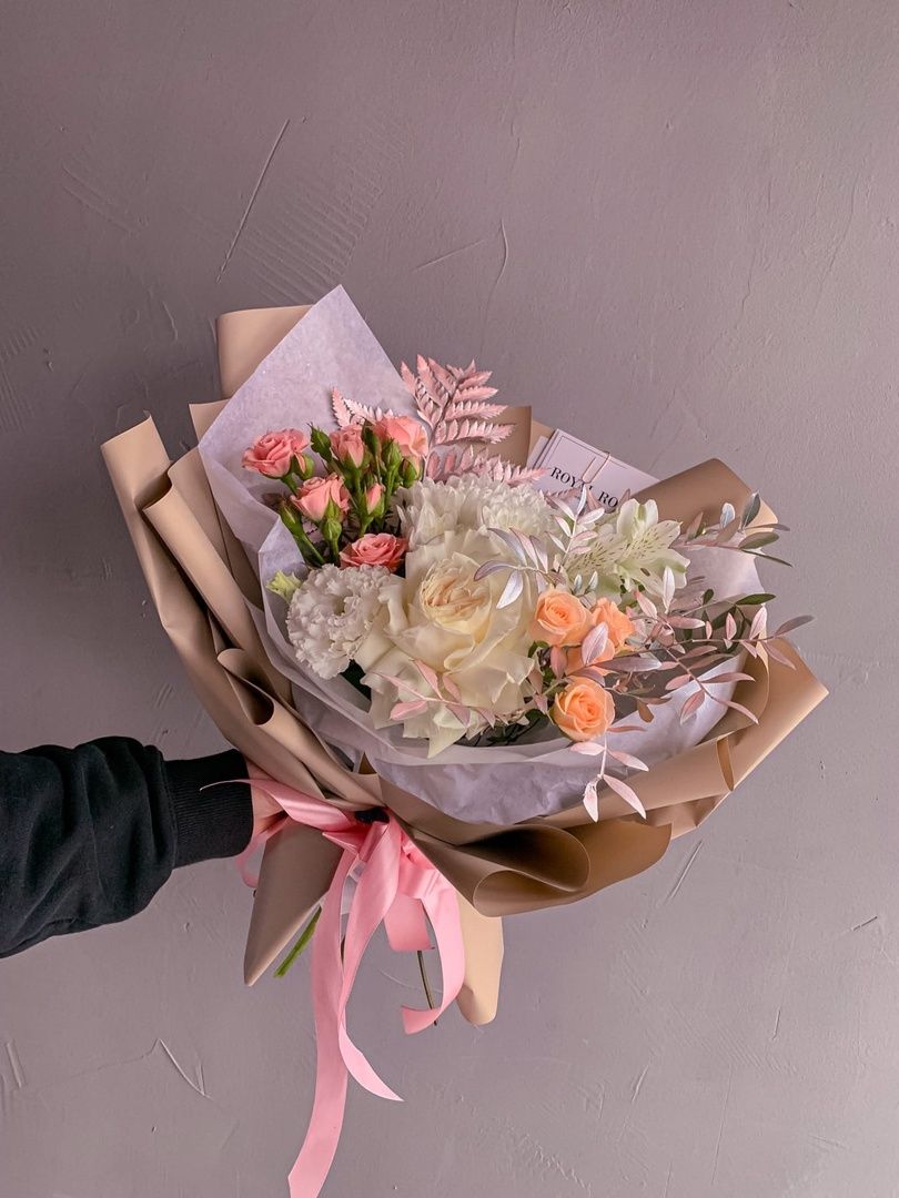 Букет в сдержанных оттенках белого, нежно-розового и кремового станет отличным подарком, который мы можем в ближайшее время доставить курьером )