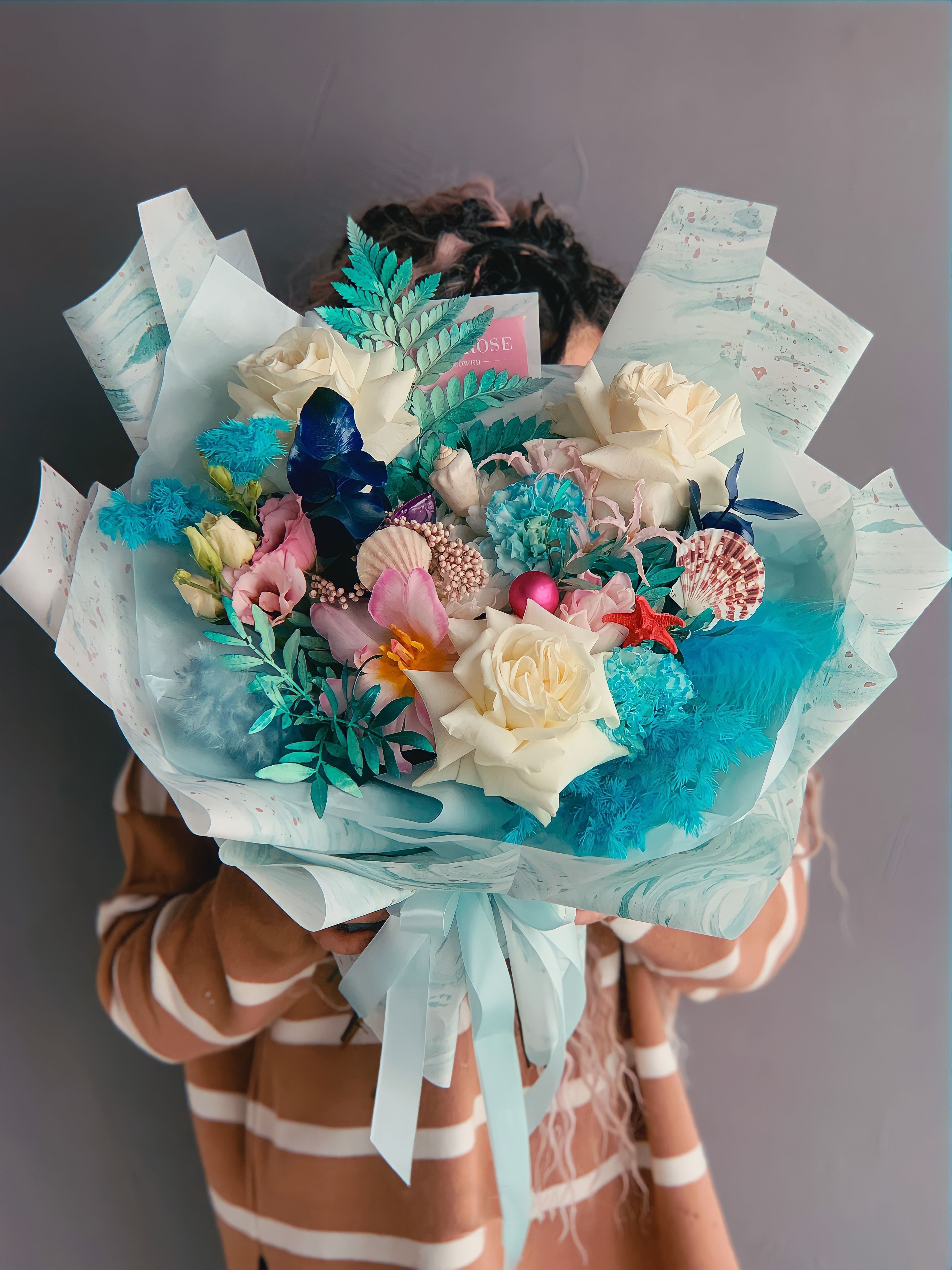 Оригинальное оформление букета "Океан" делает его по-настоящему привлекательным и эффектным. Цветочная композиция украшена атласной лентой, которая добавляет нотку шик