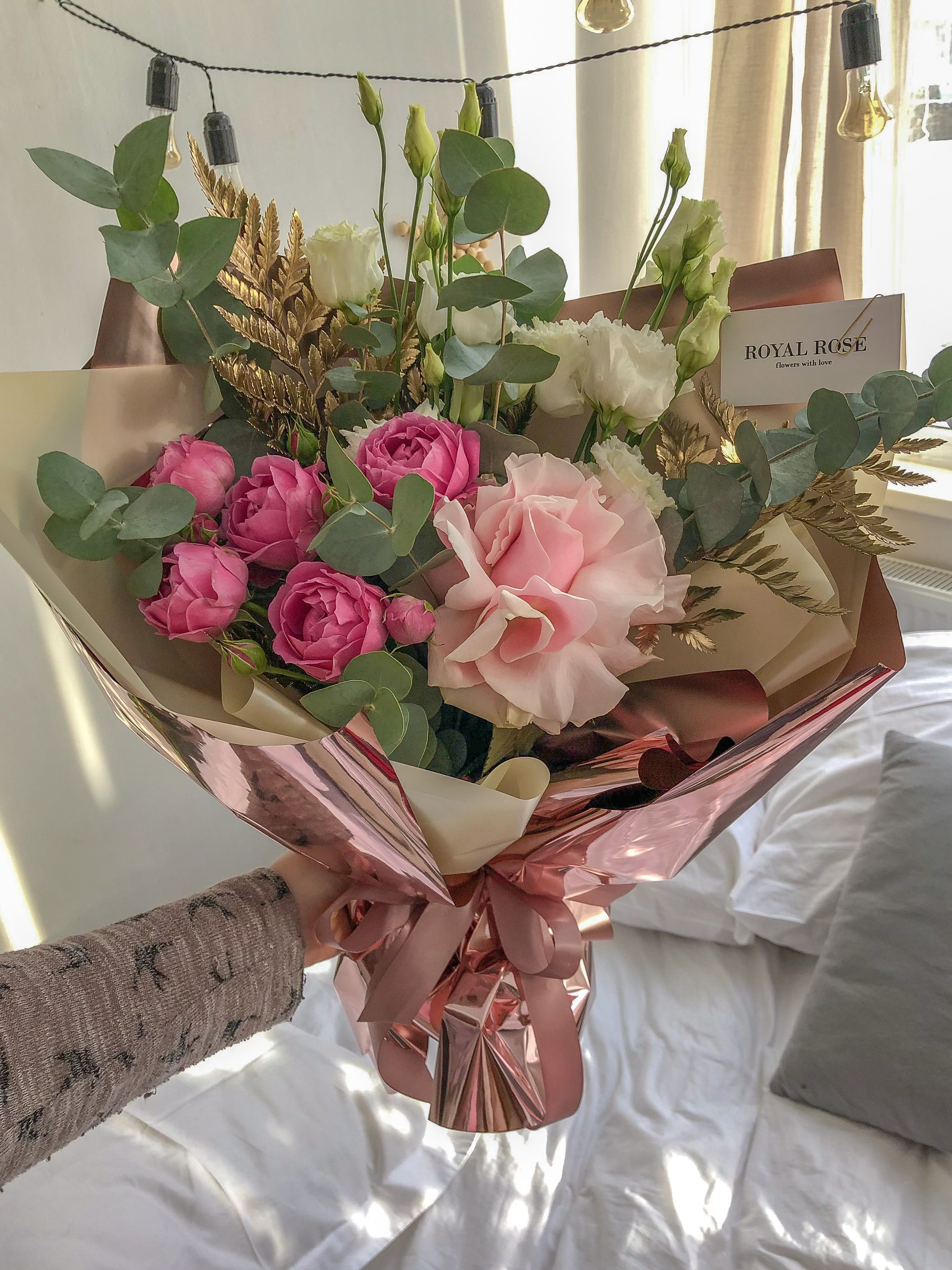 Стильный букет с пионовидной розой, эвкалиптом, эустомой и золотистым папоротником в упаковке цвета меди