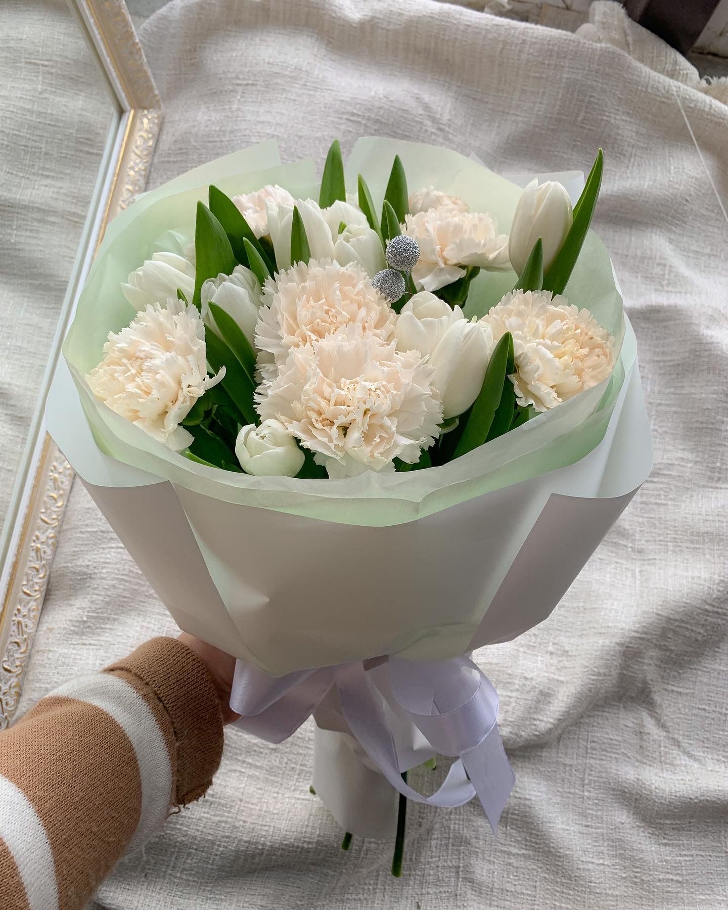 Нежный букет с белыми тюльпанами и бежевыми диантусами