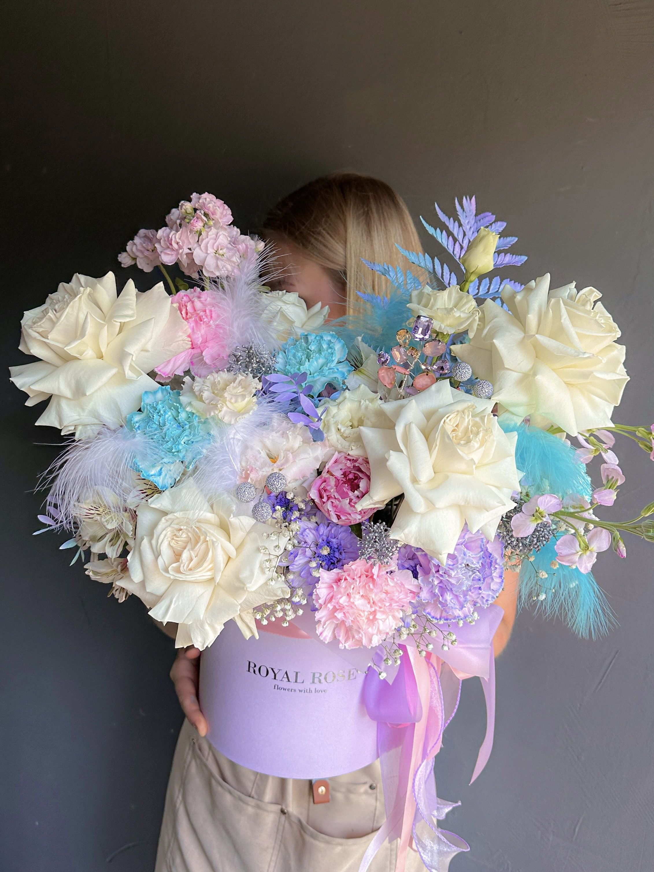 Цветочная композиция из настоящего хлопка, эустомы, роз, хризантем, статицы, лимониума, альстромерий, диантуса и экзотической зелени не оставит равнодушной ниодну девушку.