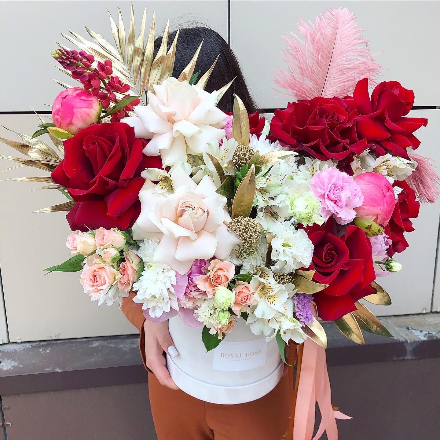 Роскошная компрзиция из красных и белых ажурных роз, эустом, пионов, золотой зелени, альстромерий, гвоздик и перьев страуса