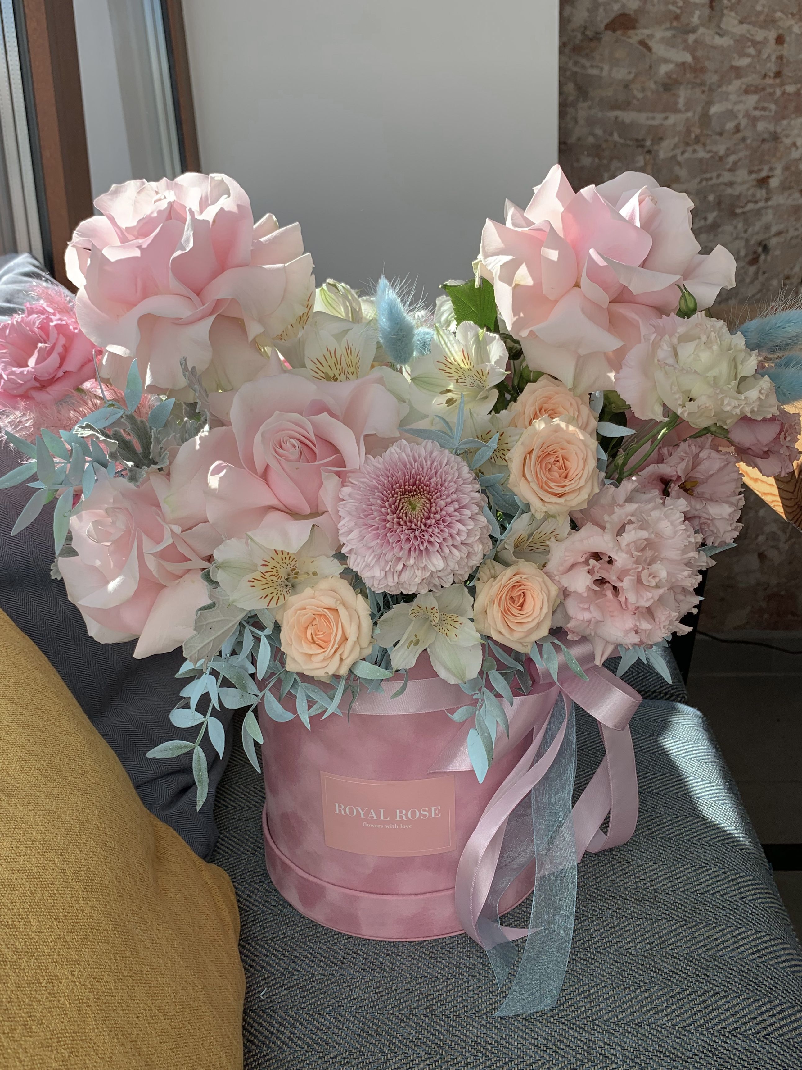 Нежная коробочка с кружевными розами, эустомой, голубой зеленью, кустовыми розами и альстромерией в фирменной коробочке из нежнейшего бархата