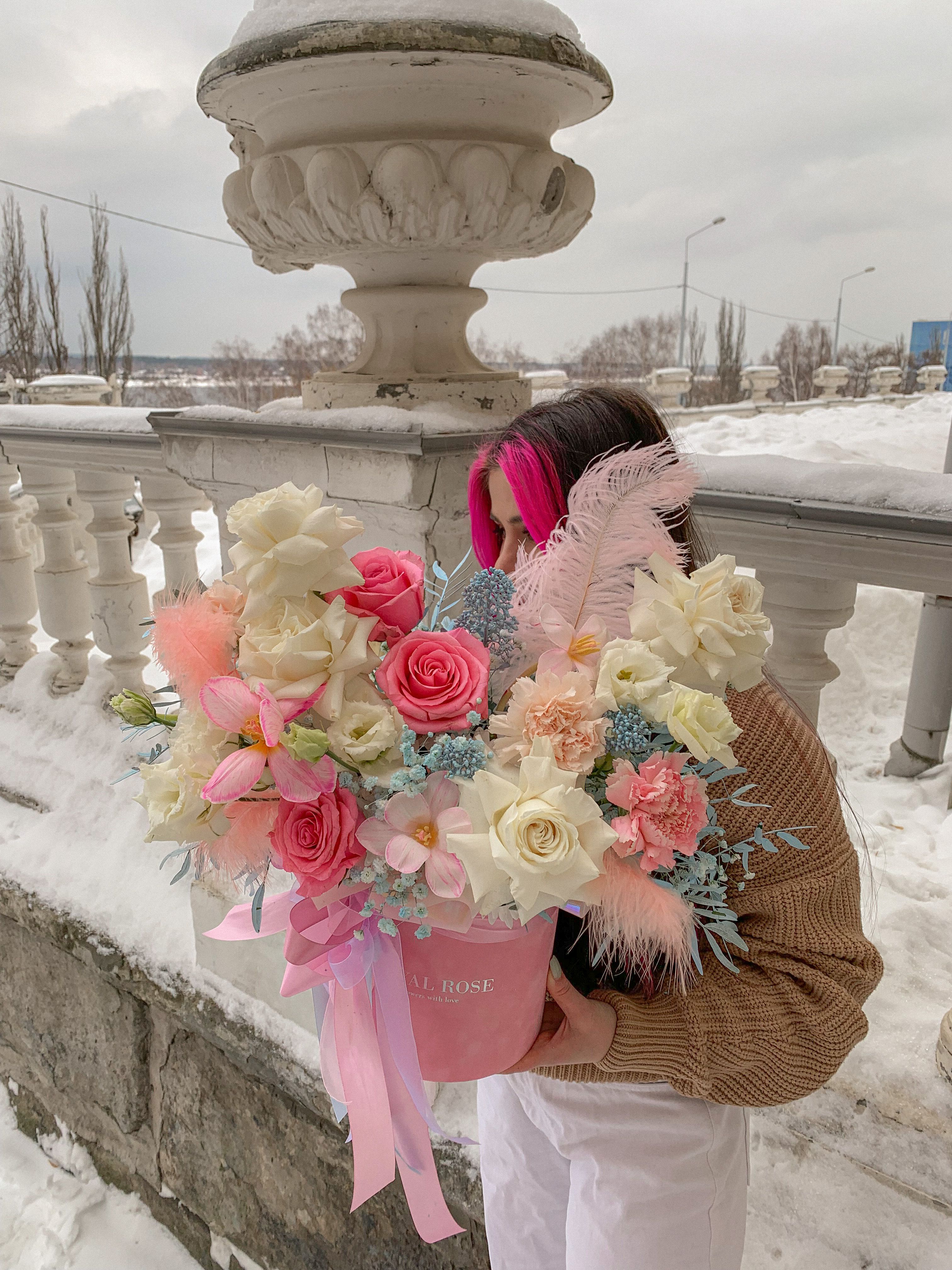 Роскошный букет в розовой бархатной коробке с розами, тюльпанами, скимией, диантусами, перьями и эустомой