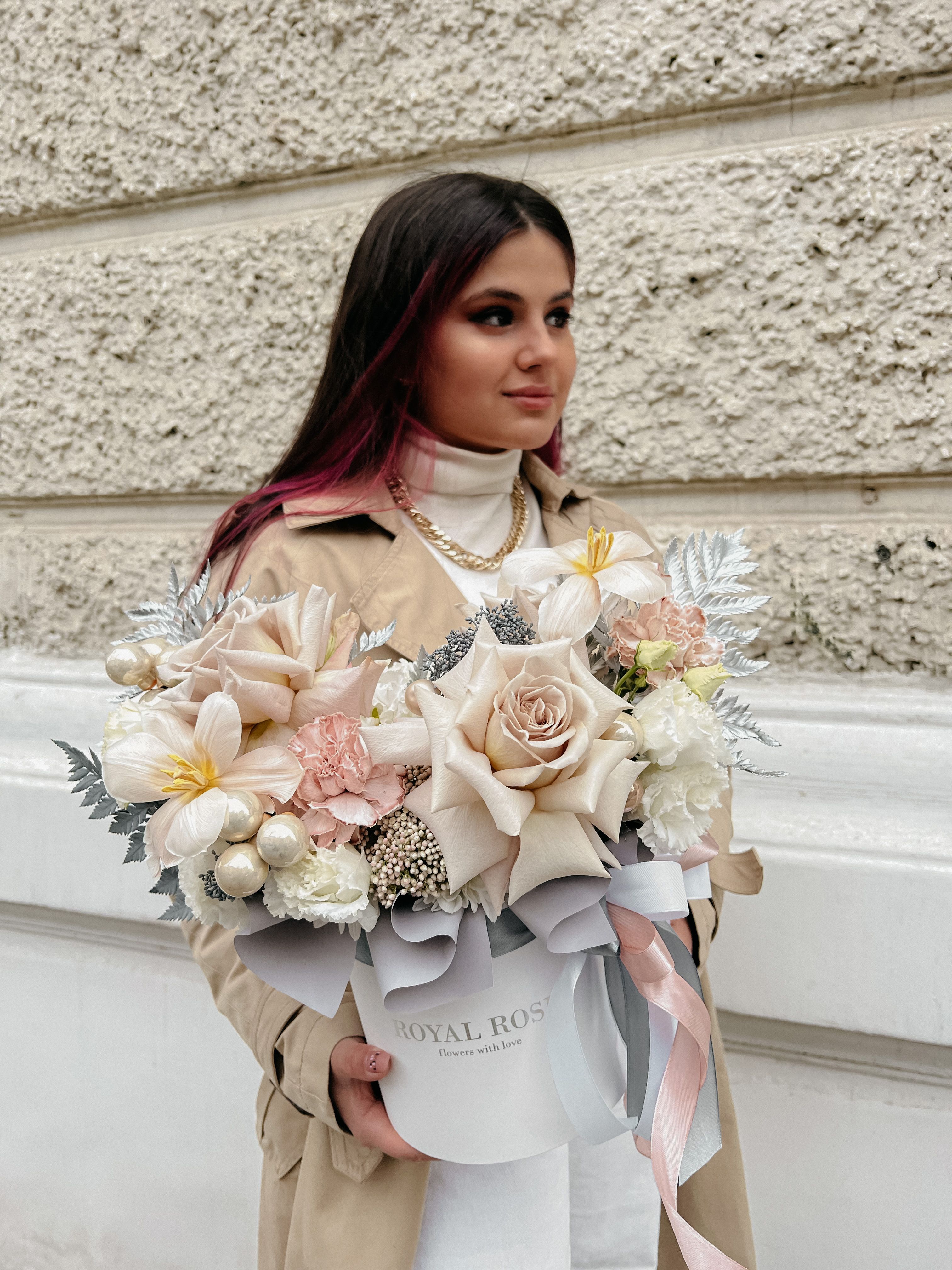 Нежная композиция в коробочке из бело-бежевых цветов. В составе букета кружевные розы, диантусы, эустома, тюльпаны, серебристо-белая зелень, бусины и шарики