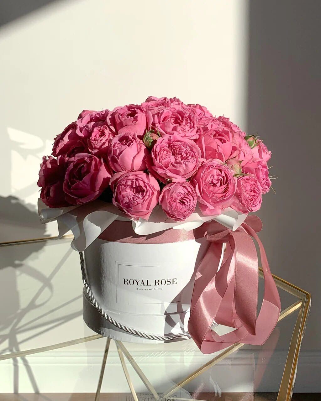 Коробочка с уникальными розами сорта, пионовидных Мисти Баблс в фирменом оформлении