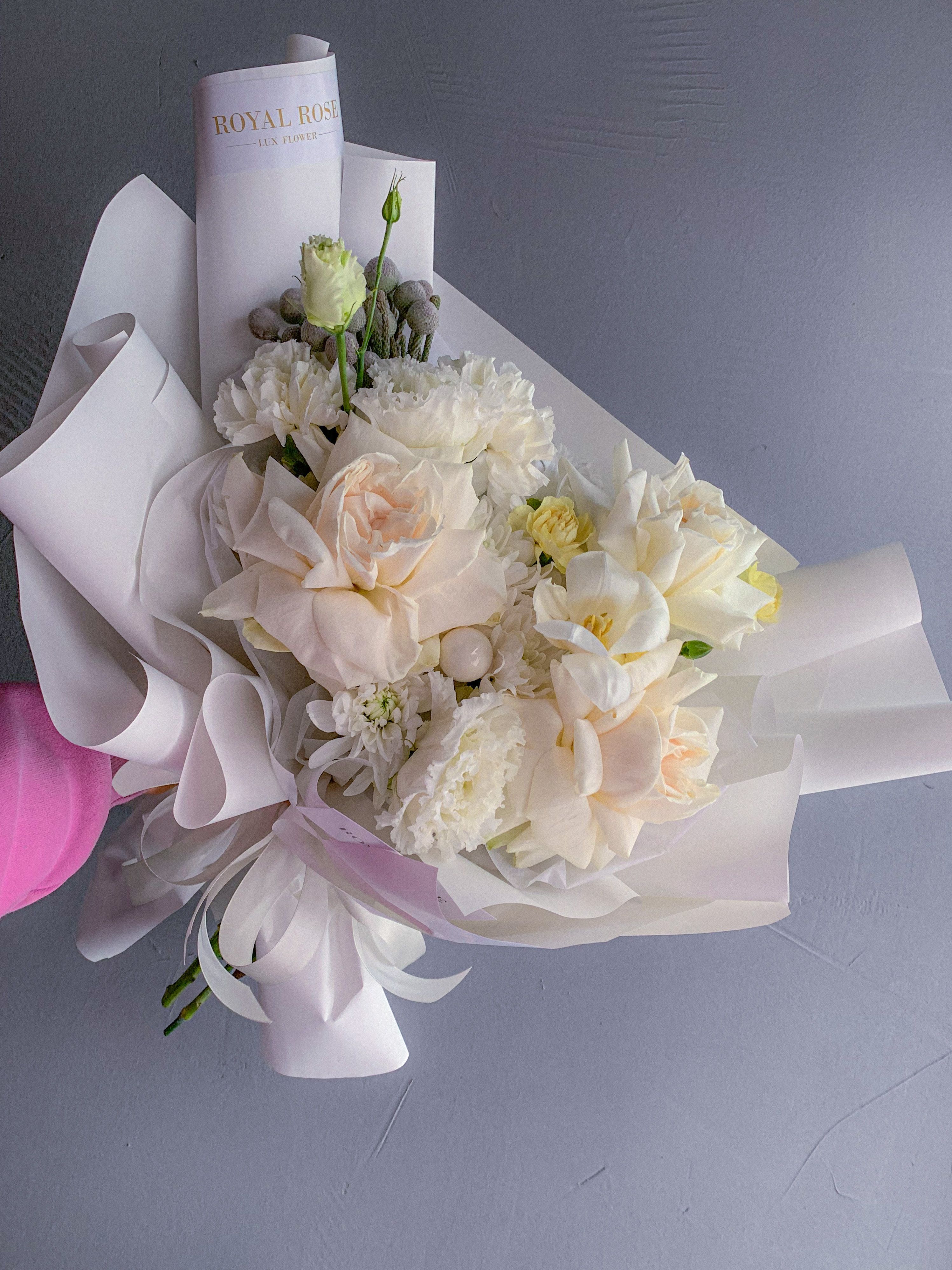 акция Лёгкость Букет в белых оттенках, с кружевными розами, белоснежными гвоздиками, зеленью и эустомой. акция 4 500 ₽ Оформить заказ Букет в белых оттенках, с кружевными розами, белоснежными гвоздиками, зеленью и эустомой. Дополнения к букетуКонфеты шоколадные с цветами 3 500 ₽Клубника с голубикой в шоколаде 4 500 ₽Букет Princess с клубникой 4 690 ₽рекомендуемФирменная VIP открытка к букету 100 ₽