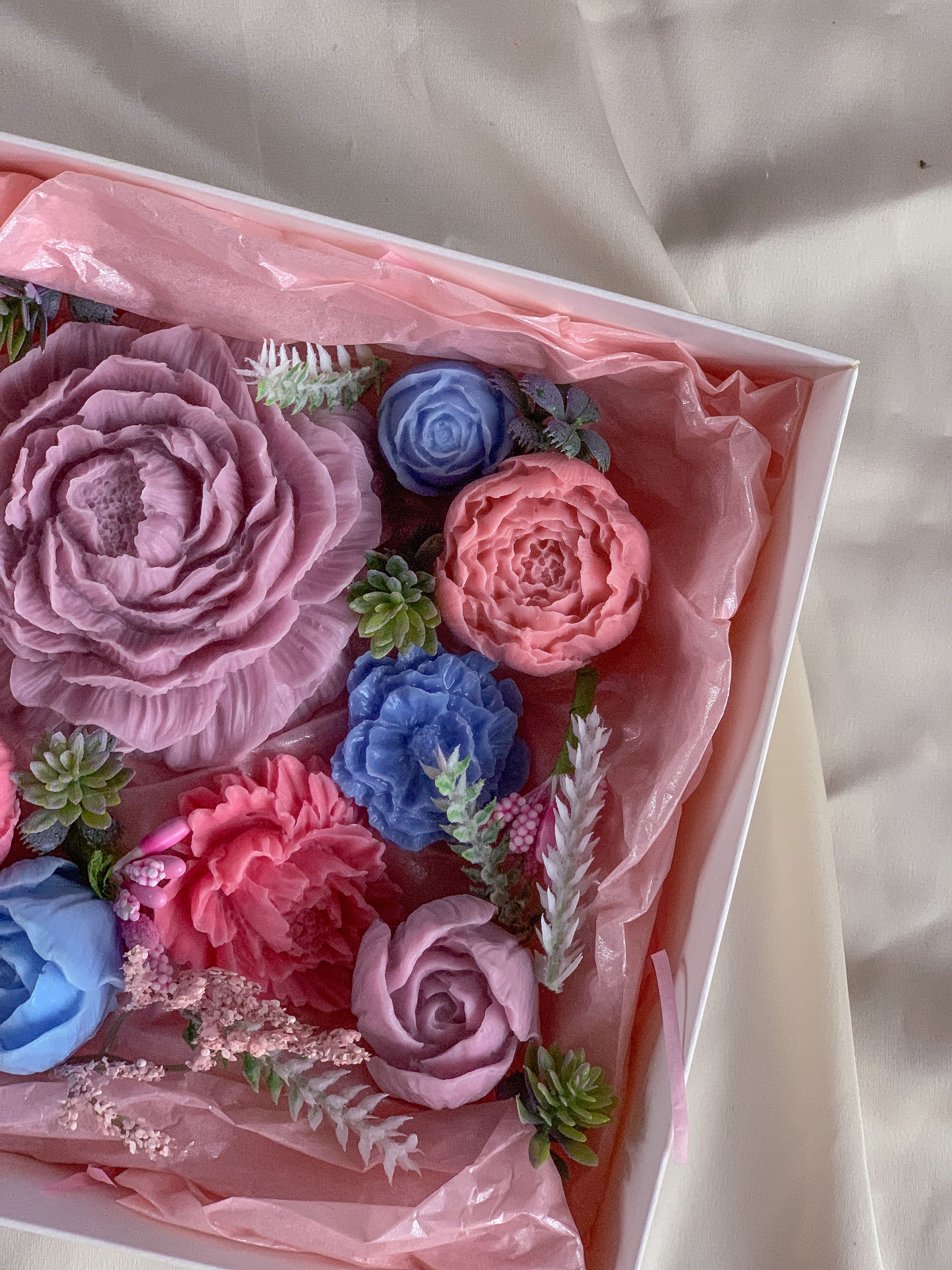 Невероятное сочетание пионов, тюльпанов, анемона и роз в стильных оттенках с приятным ароматом сладостей и жвачки. И вся эта композиция - мыло, созданное с помощью профессиональных отдушек, пищевых красителей (не вредят коже) и увлажняющего кокосового масла.