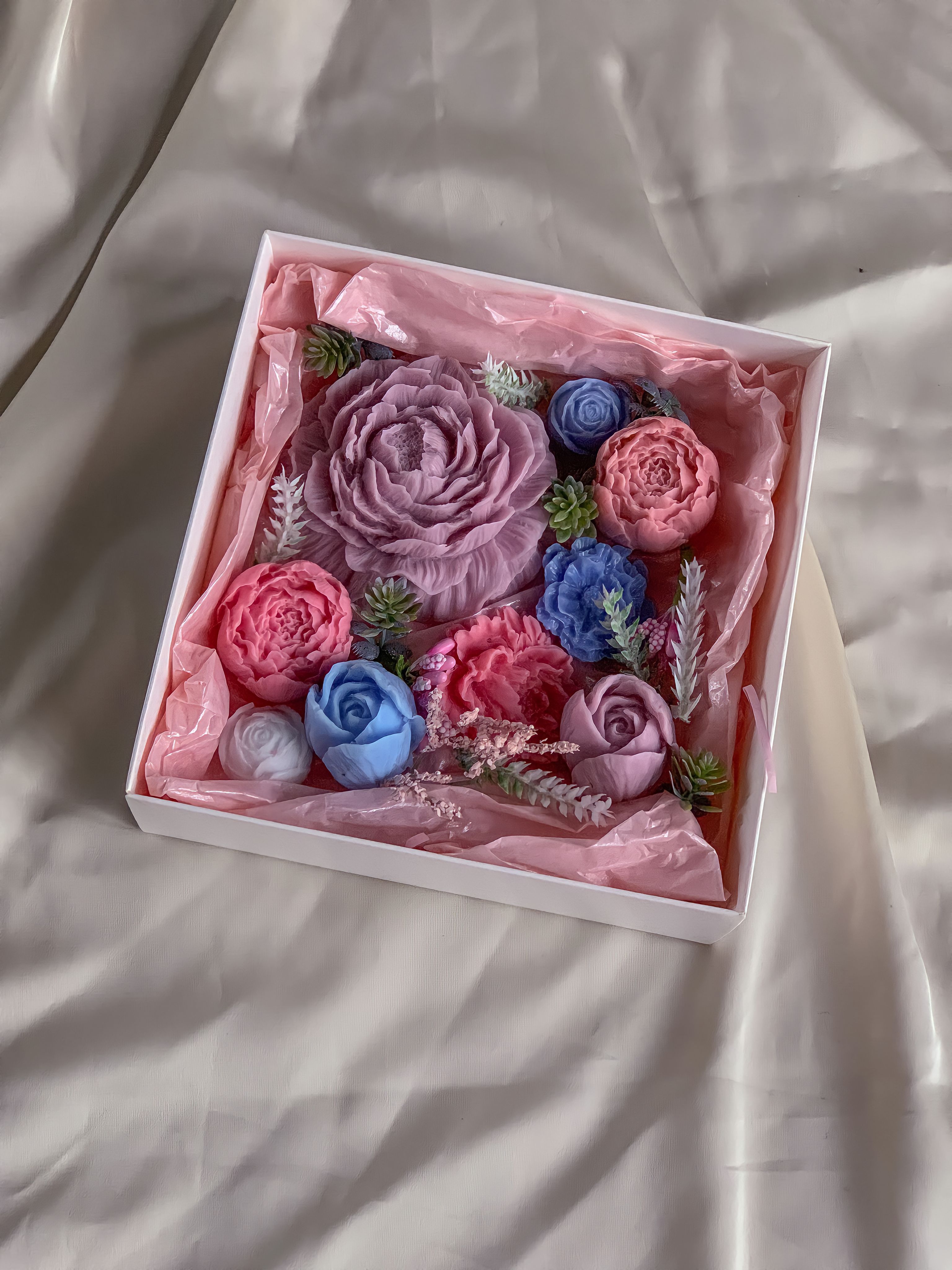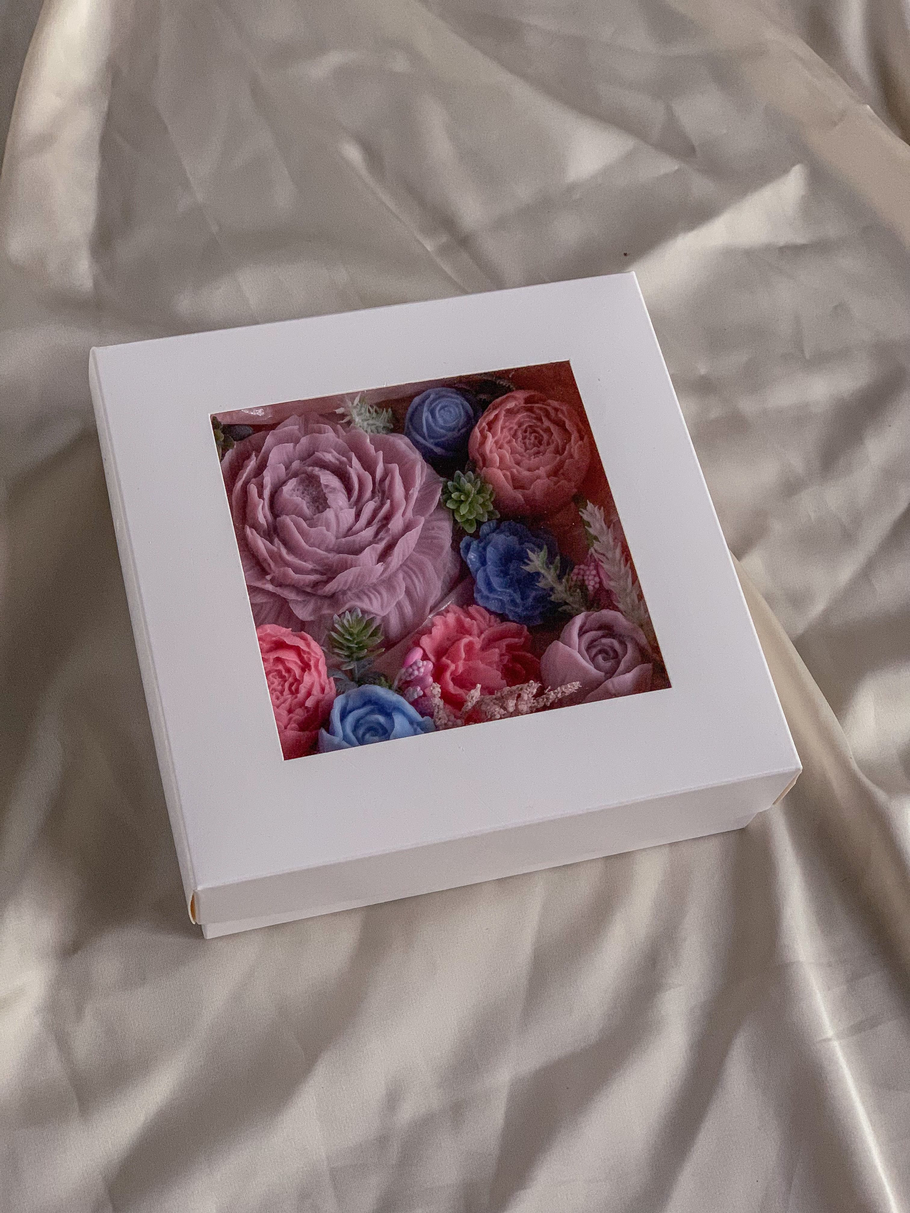 В набор входят: 9 цветов из мыла, декор, стильная коробка 12х12 (оформленная бантом из атласной ленты) и фирменная карточка.