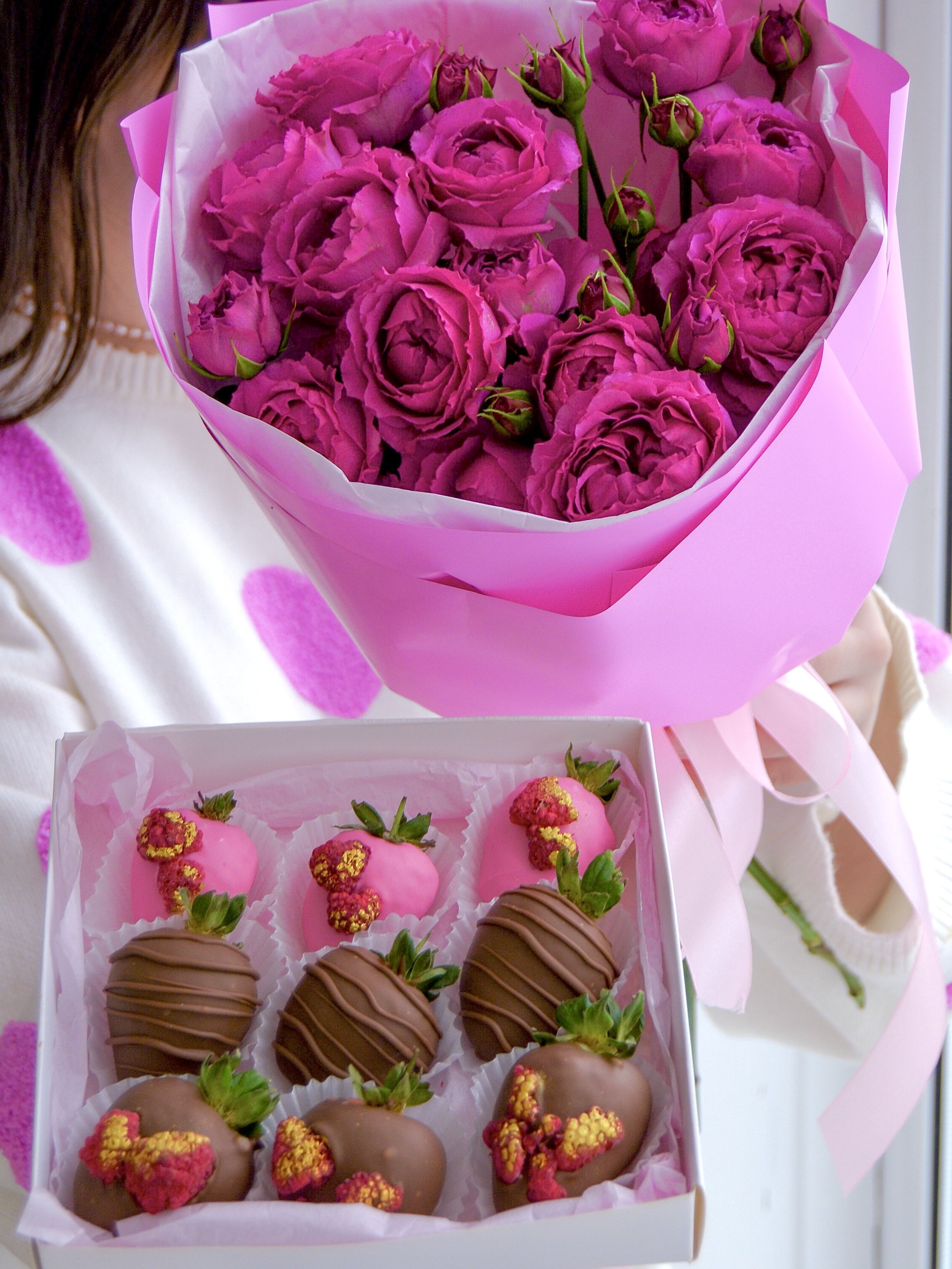 Невероятно красивый комбо набор из кустовых пионовых розовых роз и клубники в молочном бельгийском шоколаде. Свежие ягоды клубники украшены ягодками сублимированный малины, миндалем и золотом