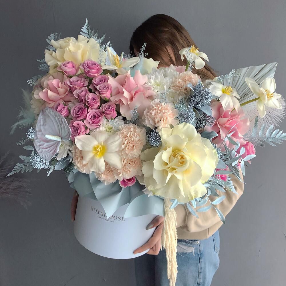 Составление в нежных розовых и голубых оттенках из крупных белых французских роз и пиона - образующей розы. Наш флорист создаст для вас это произведение искусства из самых свежих растений.