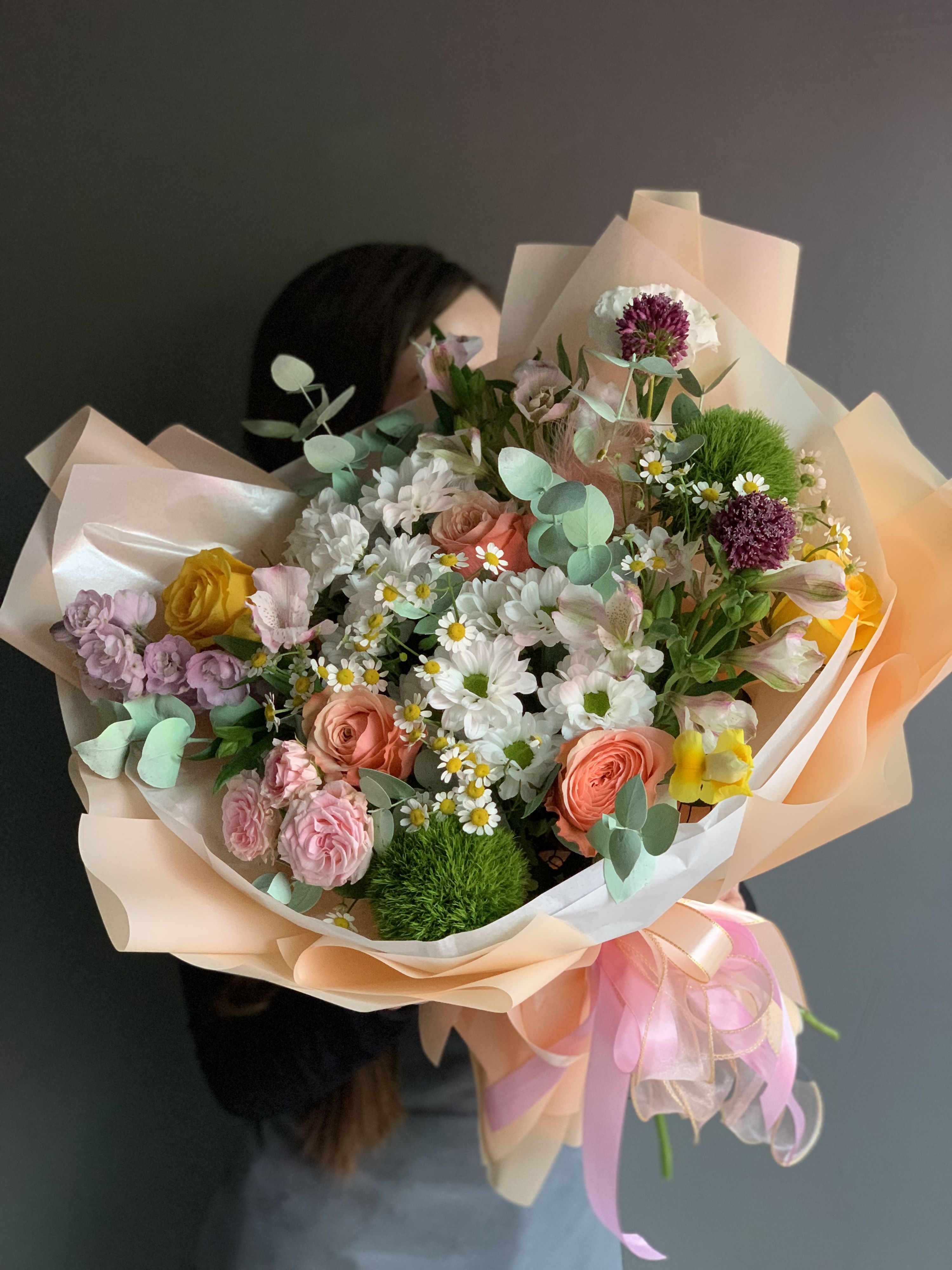 Букет «Пейзаж» в полевом стиле с пионовидными розами, ромашками, диантусами, кустовой розой и эвкалиптом