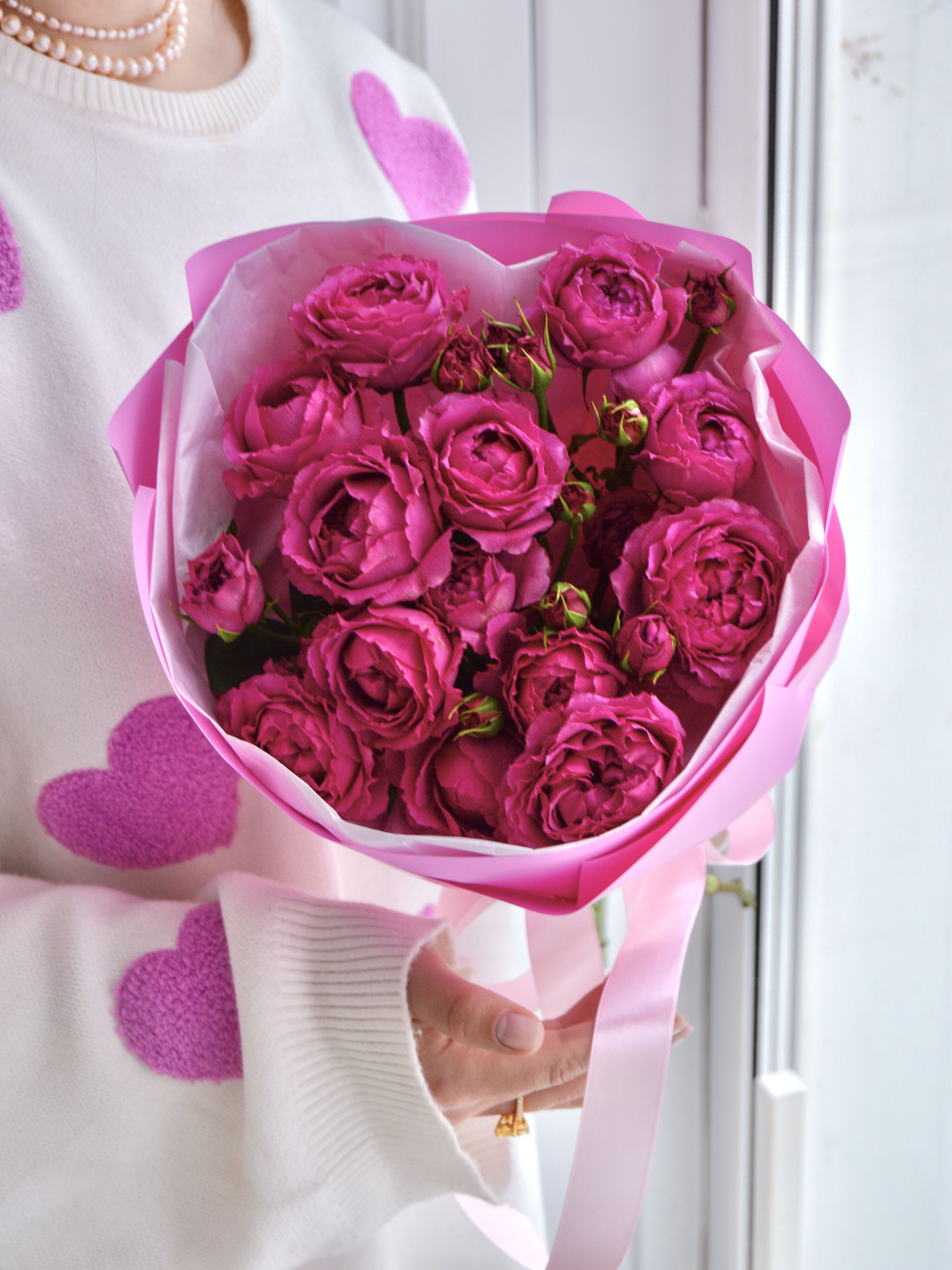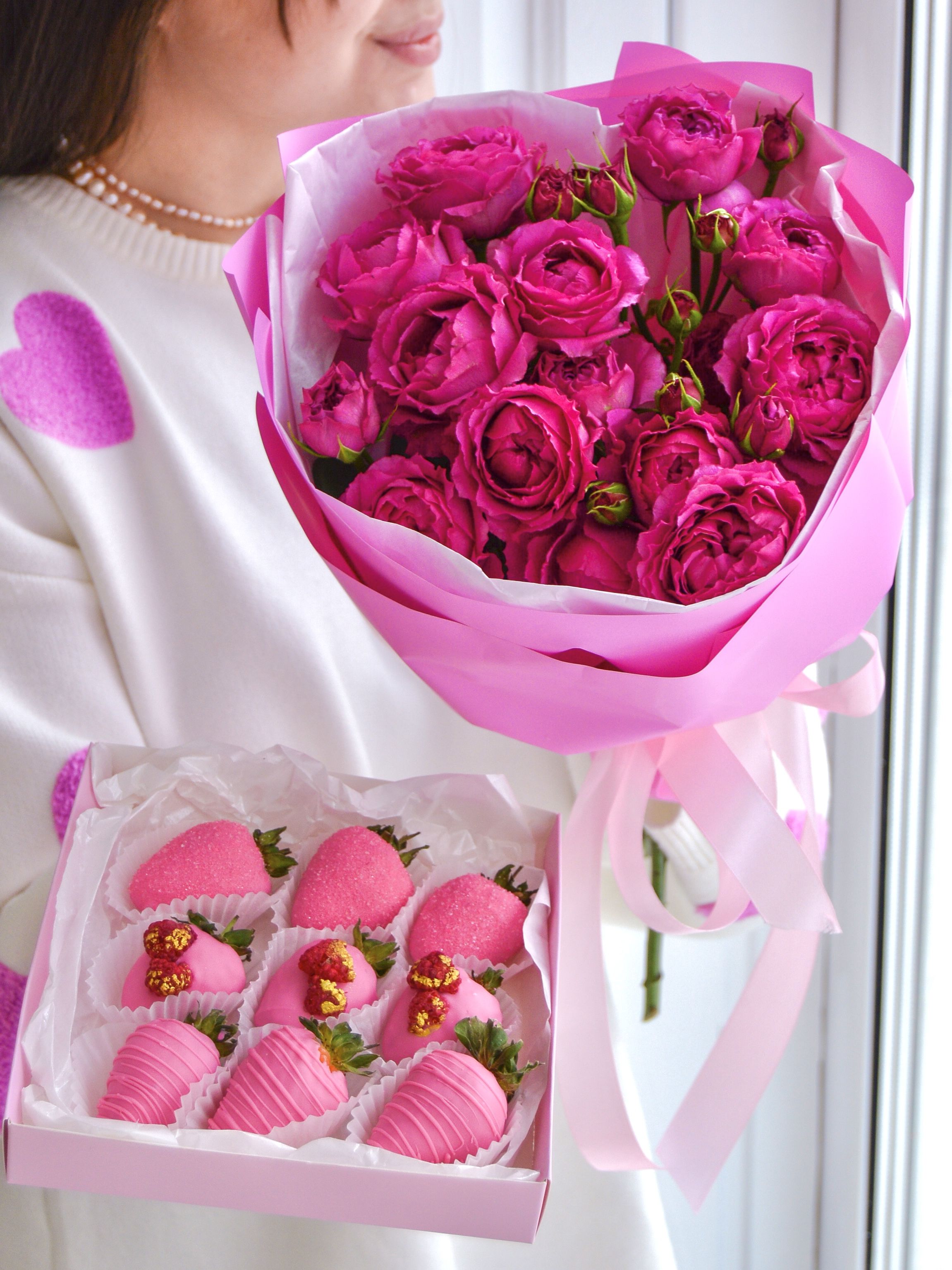 Невероятно красивый комбо набор из кустовых пионовых розовых роз и клубники в белом бельгийском шоколаде. Свежие ягоды клубники украшены ягодками сублимированный малины, миндалем и золотом