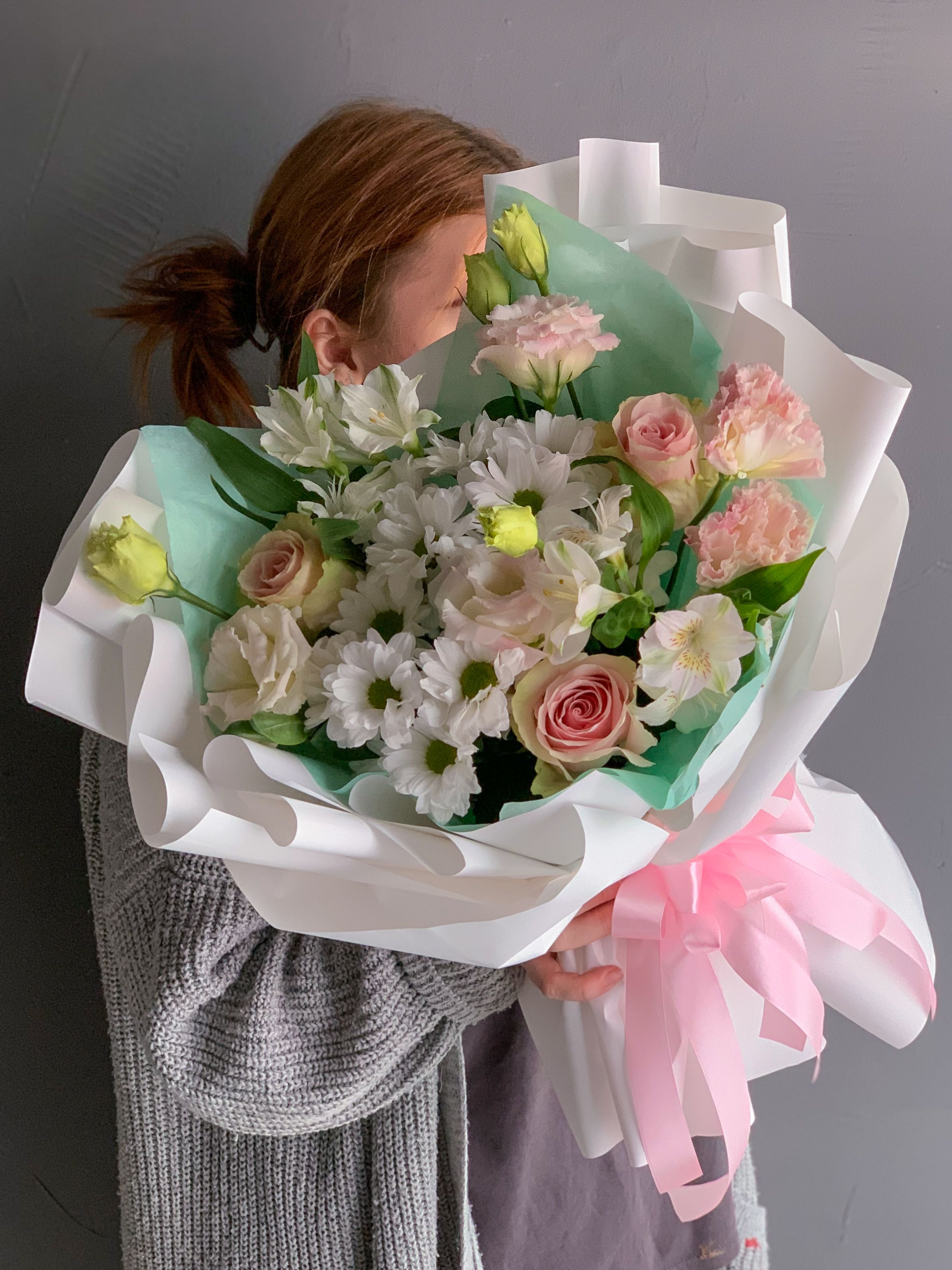 Букет с розовыми розами ромашками, эустомой и белой альстромерий.