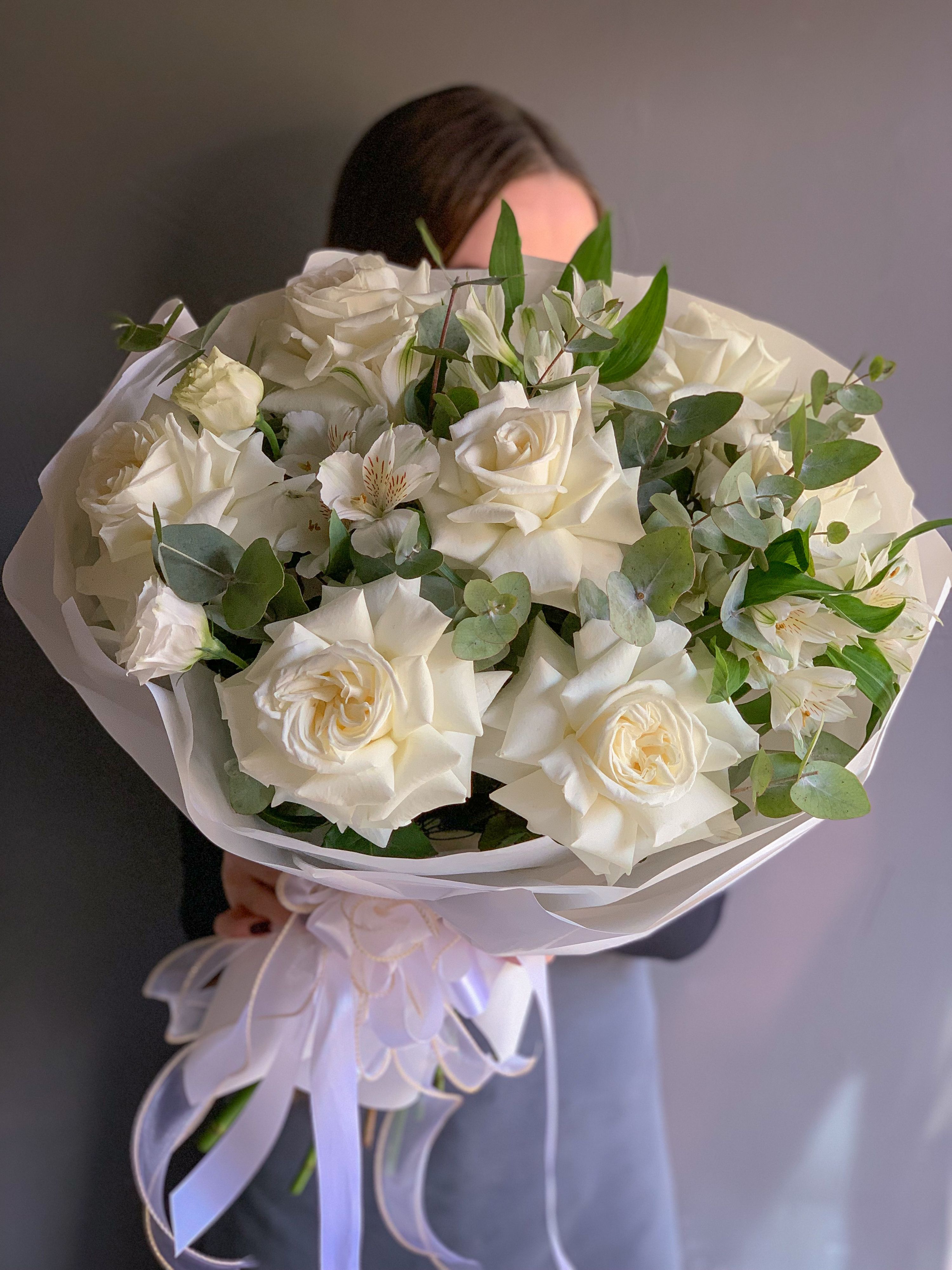 Круглый букет White из белоснежных пионовидных французских роз с белой алтстромерией и эвкалиптом.