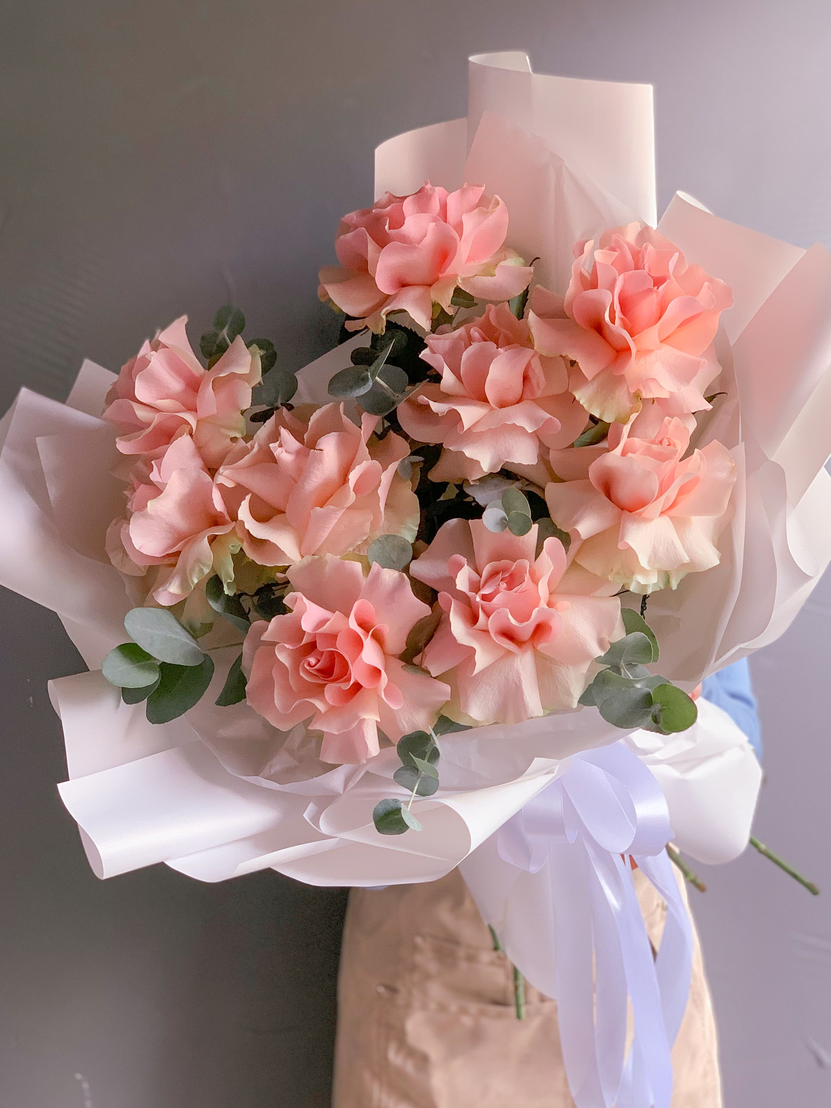 Большой моно букет из розовых эквадорских кружевных роз с ароматным эвкалиптом в белой стильной упаковке.