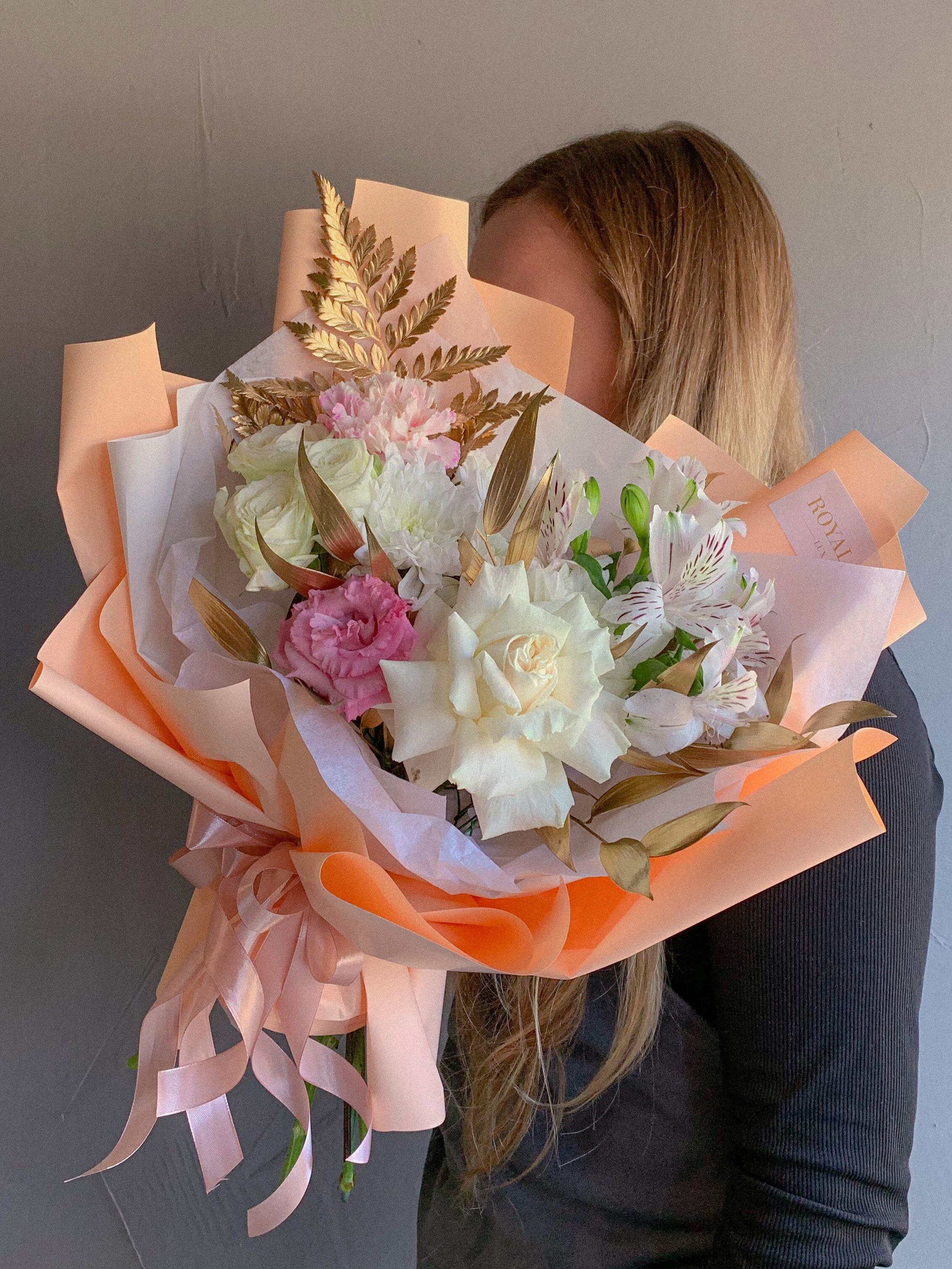 Букет с фирменными кружевными белыми розами, розовой эустомой, альстромерией, золотым папоротником в оформлении Royal.